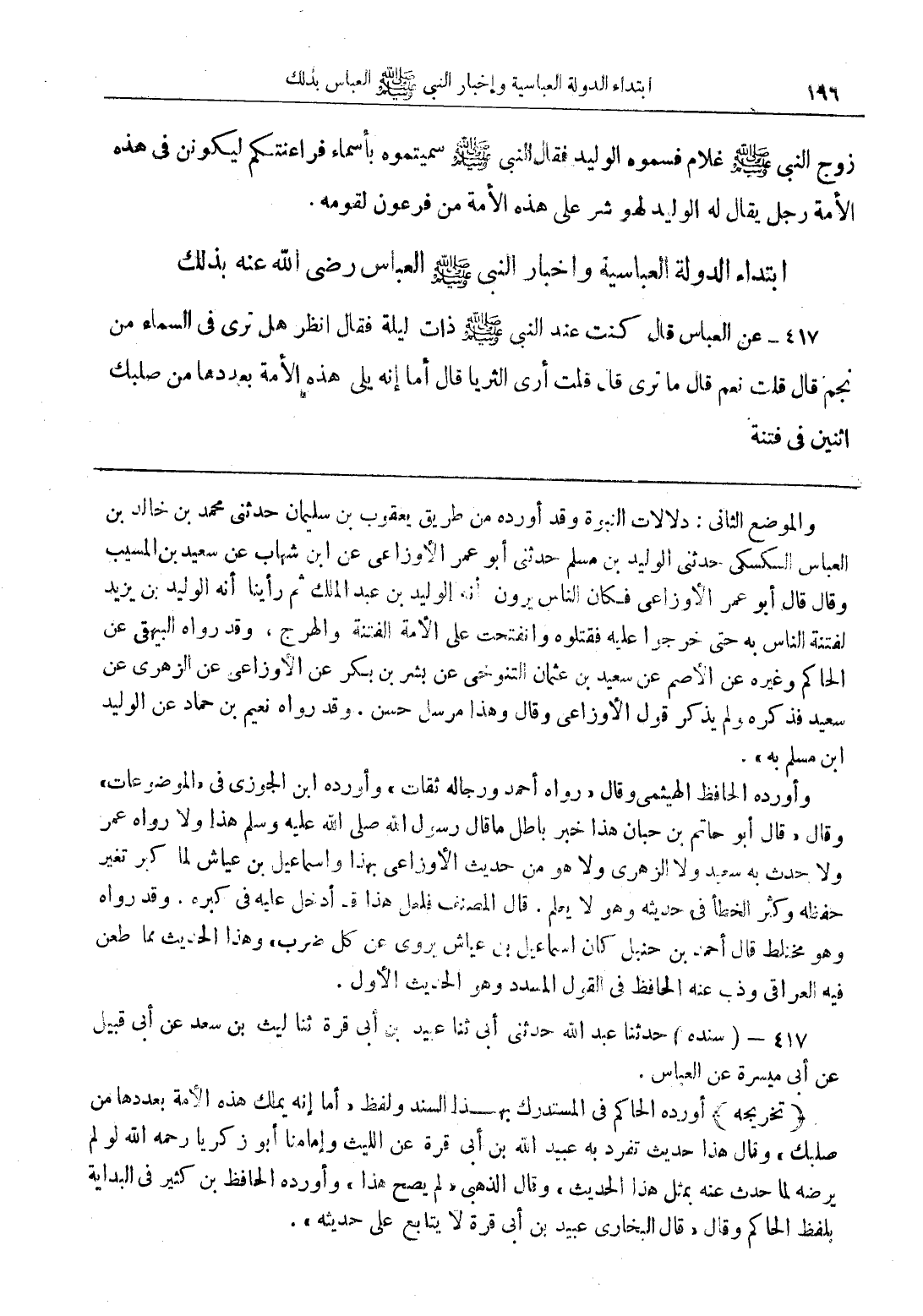 417 - عن العباس قال كنت عند النبي (صلى الله عليه وسلم) ذات ليلة فقال أنظر هل ترى في السماء من نجم قال قلت نعم قال ما ترى قل قلت أرى الثريا قال أما إنه يلي هذه الأمة بعددها من صلبك اثنين في فتنة.