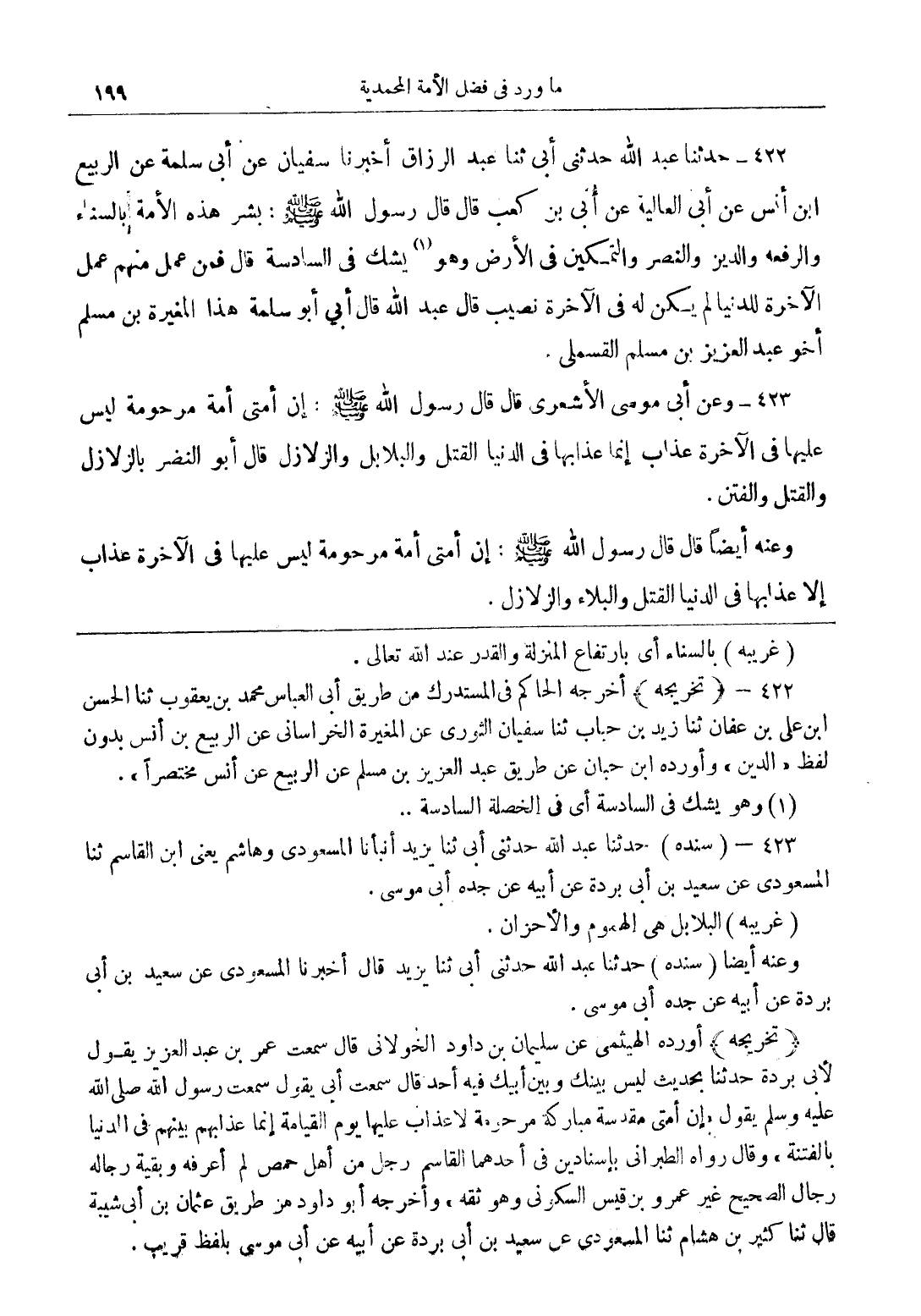 423 - وعن أبى موسي الأشعري قال قال رسول الله (صلى الله عليه وسلم): إن أمتي أمة مرحومة ليس عليها في الآخرة عذاب إنما عذابها في الدنيا القتل والبلابل والزلالزل قال أبو النضر بالزلالزل والقتل والفتن.