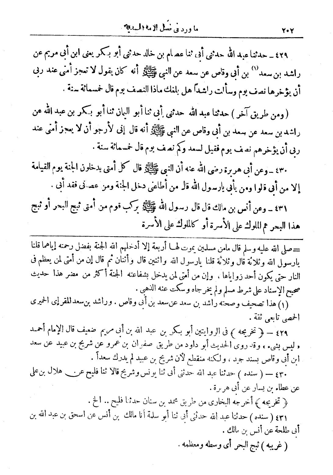 (ومن طريق آخر) حدثنا عبد الله حدثني أبى ثنا أبو اليمان ثنا أبو بكر بن عبد الله عن راشد بن سعد عن سعد بن أبى وقاص عن النبي (صلى الله عليه وسلم) أنه قال إني لأرجو أن لا يعجز أمتي عند ربي أن يؤخرهم نصف يوم فقيل لسعد وكم نصف يوم قال خمسمائة سنة.
