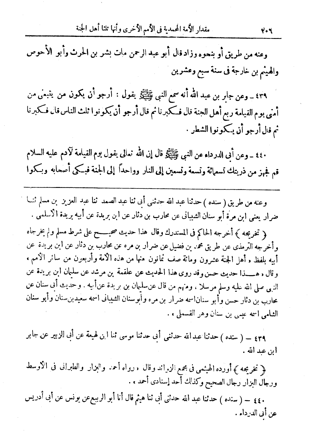 439 - وعن جابر بن عبد الله أنه سمع النبي (صلى الله عليه وسلم) يقول: أرجو أن يكون من يتبعني من أمتي يوم القيامة ربع أهل الجنة قال فكبرنا ثم قال أرجو أن يكونوا ثلث الناس قال فكبرنا ثم قال أرجو أن يكونوا الشطر.