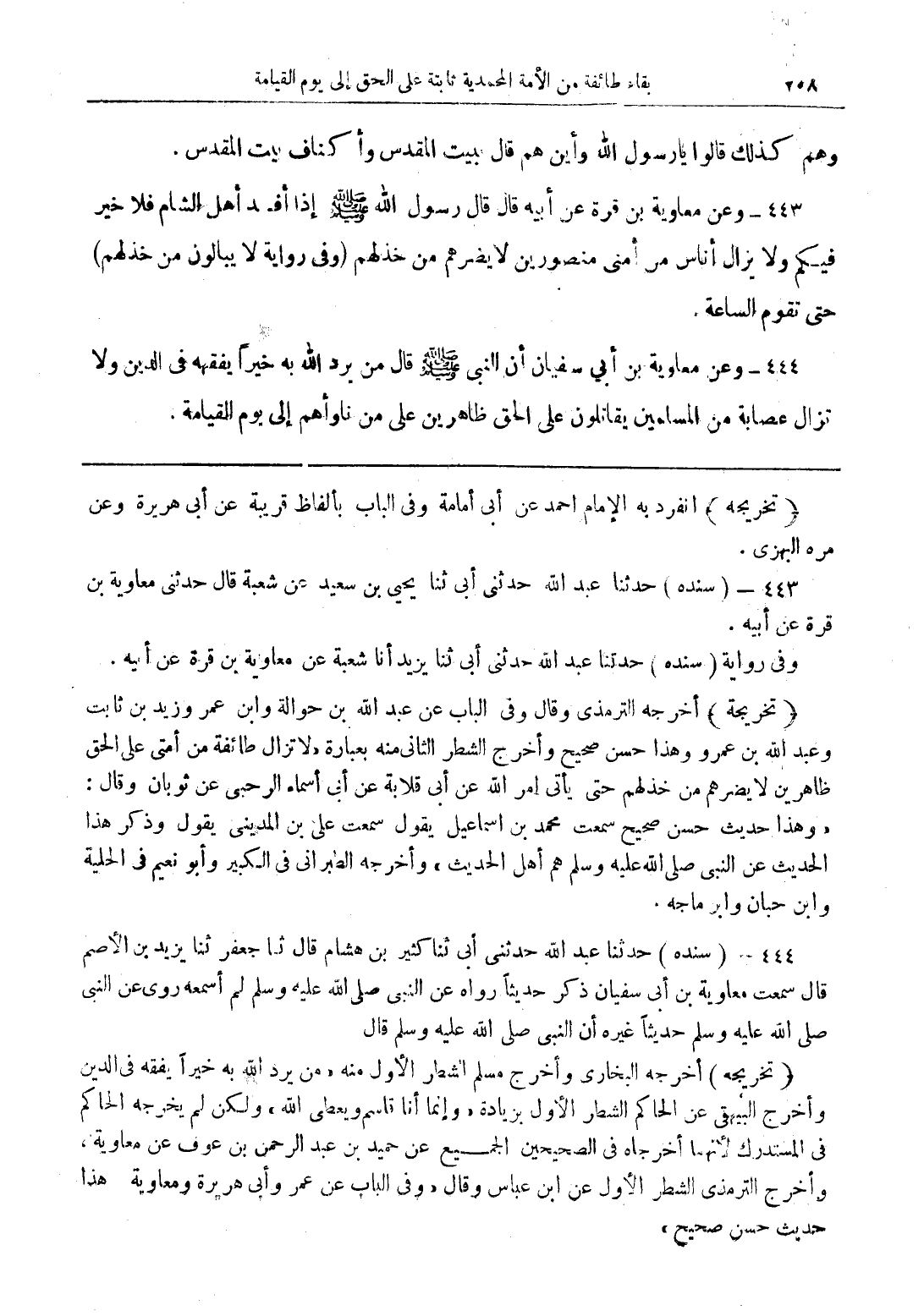 444 - وعن معاوية بن أبى سفيان أن النبي (صلى الله عليه وسلم) قال من يرد الله به خيرًا يفقه في الدين ولا تزال عصابة من المسلمين يقاتلون على الحق ظاهرين على من ناوأهم إلى يوم القيامة.