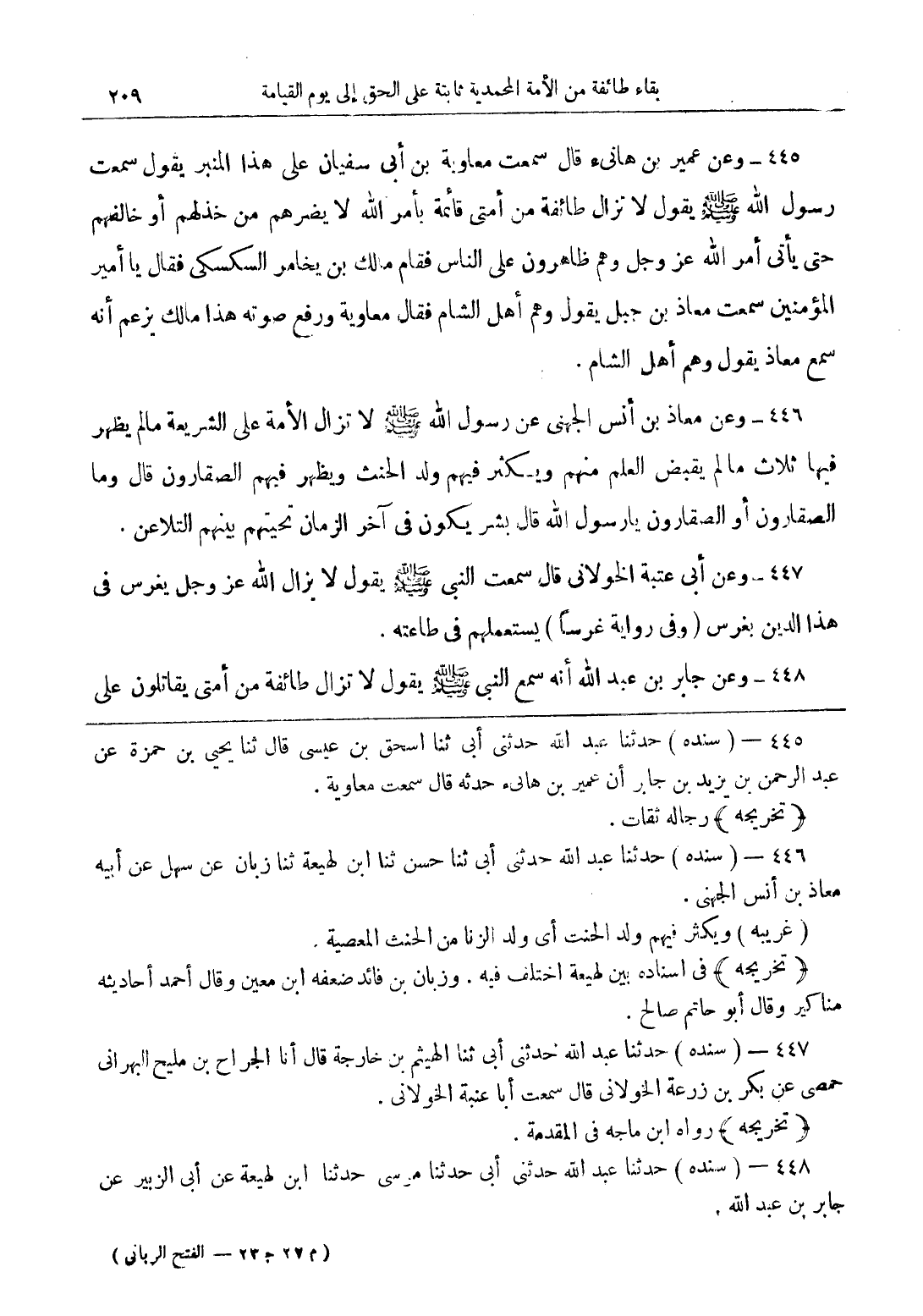 445 - وعن عمير بن هانئ قال سمعت معاوية بن أبى سفيان على هذا المنبر يقول سمعت رسول الله (صلى الله عليه وسلم) يقول لا نزال طائفة من أمتى قائمة بأمر الله لا يضرهم من خذلهم أو خالفهم حتى يأتي أمر الله عز وجل وهم ظاهرون على الناس فقام مالك بن يخامر السكسكسي فقاليا أمير المؤمنين سمعت معاذ بن جبل يقول وهم أهل الشام فقال معاوية ورفع صوته هذا مالك يزعم أنه سمع معاذ يقول وهم أهل الشام.