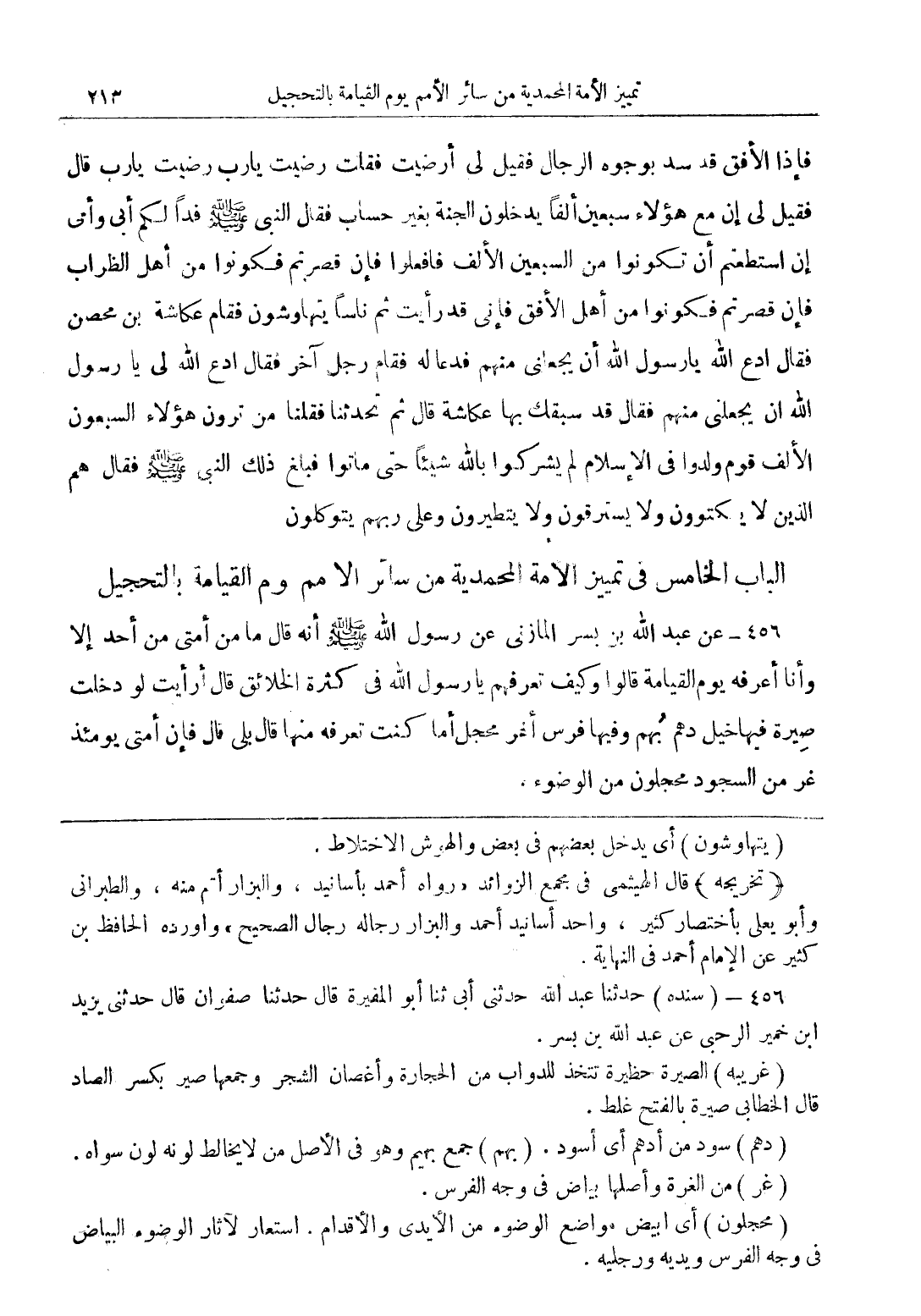 456 - عن عبد الله بن بسر المازني عن رسول الله (صلى الله عليه وسلم) أن قال ما من أمتي من أحد إلا وأنا أعرفه يوم القيامة قالوا وكيف تعرفهم يا رسول الله في كثرة الخلائق قال أرأيت لو دخلت صيرة فيها خيل دهم بهُم وفيها فرس أغر محجل أما كنت تعرفه منها قال بلى قال فإن أمتي يومئذ غر من السجود محجلون من الوضوء.