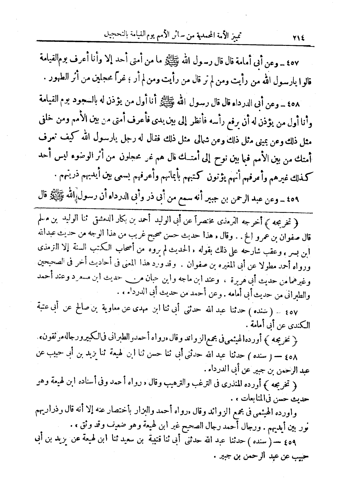 457 - وعن أبي أمامة قال قال رسول الله (صلى الله عليه وسلم) ما من أمتي أحد إلا وأنا أعرف يوم القيامة قالوا يا رسول الله من رأيت ومن لم تر قال من رأيت ومن لم أر؛ غرًا محجلين من أثر الطهور.