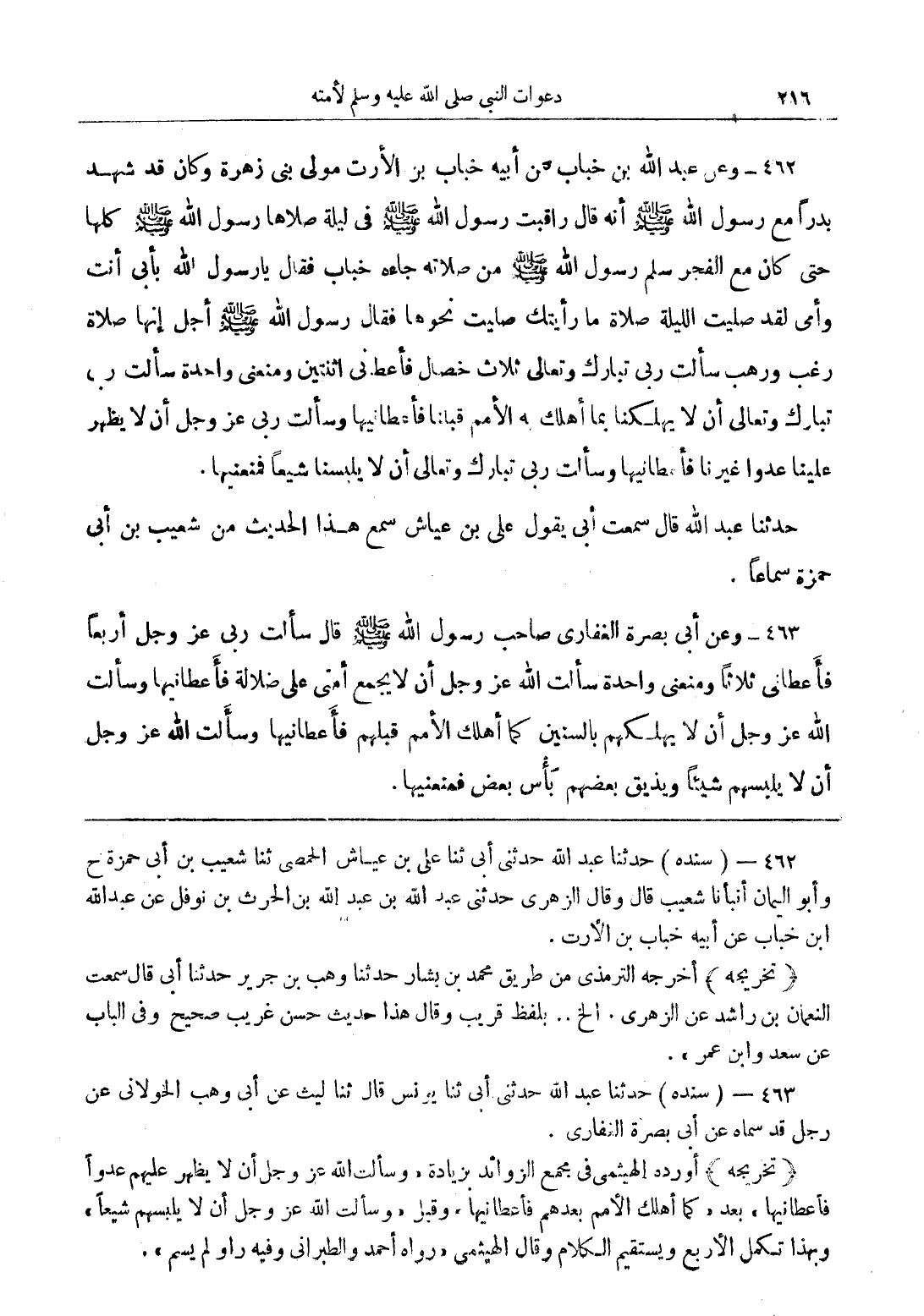 462 - وعن عبد الله بن خباب عن أبيه خباب بن الأرت مولى بني زهرة وكان قد شد بدرًا مع رسول الله (صلى الله عليه وسلم) أنه قال راقبت رسول الله (صلى الله عليه وسلم) كلها حتى كان مع الفجر سلم رسول الله (صلى الله عليه وسلم) من صلاته جاءه خباب فقال يا رسول الله بأبي أنت وأمي لقد صليت الليلة صلاة ما رأيت صليت نحوها فقال رسول الله (صلى الله عليه وسلم) أجل إنها صلاة رغب ورهب سألت ربي تبارك وتعالى ثلاث خصال فأعطاني اثنتين ومنعني واحدة سألت ربي، تبارك وتعالى أن لا يهلكنا بما أهلك به الأمم قبلنا فأعطنيها وسألت ربي عز وجل أن لا يظهر علينا عدوًا غيرنا فأعطانيها وسألت ربي تبارك وتعالى أن لا يلبسنا شيعًا فمتعتيها.