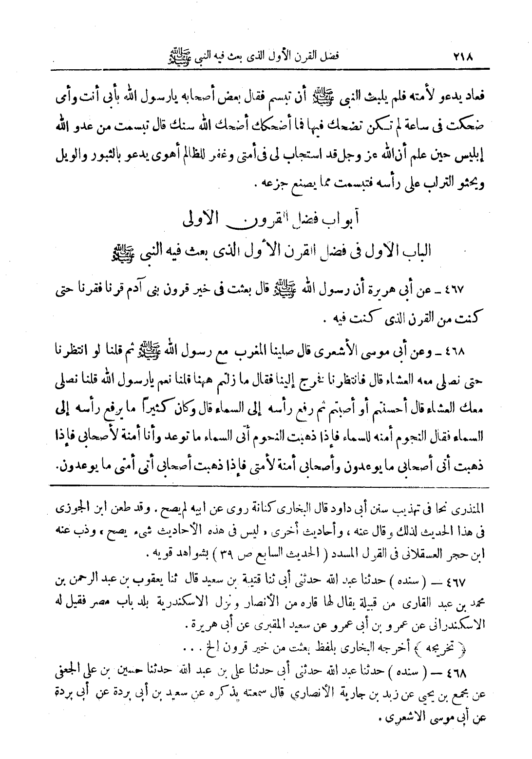467 - عن أبى هريرة أن رسول الله (صلى الله عليه وسلم) قال بعثت في خير قرون بني أدم قرنًا فقرنا حتى كنت من القرن الذي كنت فيه.