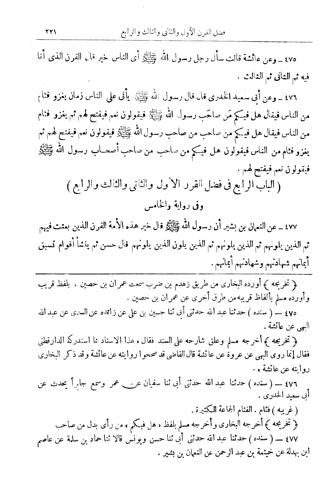 477 - عن النعمان بن بشير أن رسول الله (صلى الله عليه وسلم) قال خير هذه الأمة القرن الذين بعثت فيهم ثم الذين يلونهم ثم الذين يلونهم ثم الذين يلون الذين يلونهم قال حسن ثم ينشأ أقوام تسبق أيمانهم شهادتهم وشهادتهم أيمانهم