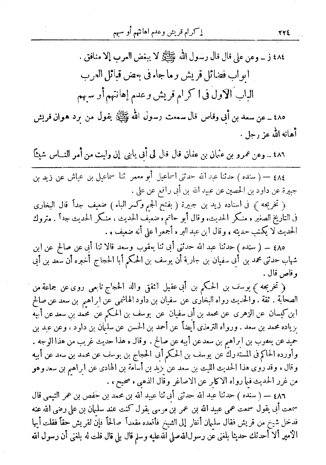 485 - عن سعد بن أبى وقاص قال سمعت رسول الله (صلى الله عليه وسلم) يقول من يرد هوان قريش أهانه الله عز وجل.