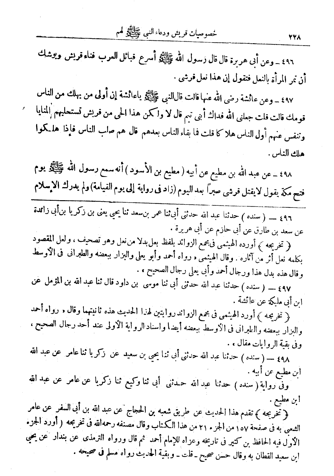 496 - وعن أبي هريرة قال قال رسول الله (صلى الله عليه وسلم أسرع قبائل العرب فناء قريش ويوشك أن تمر المرأة بالنعل فتقول إن هذا نعل قرشي.