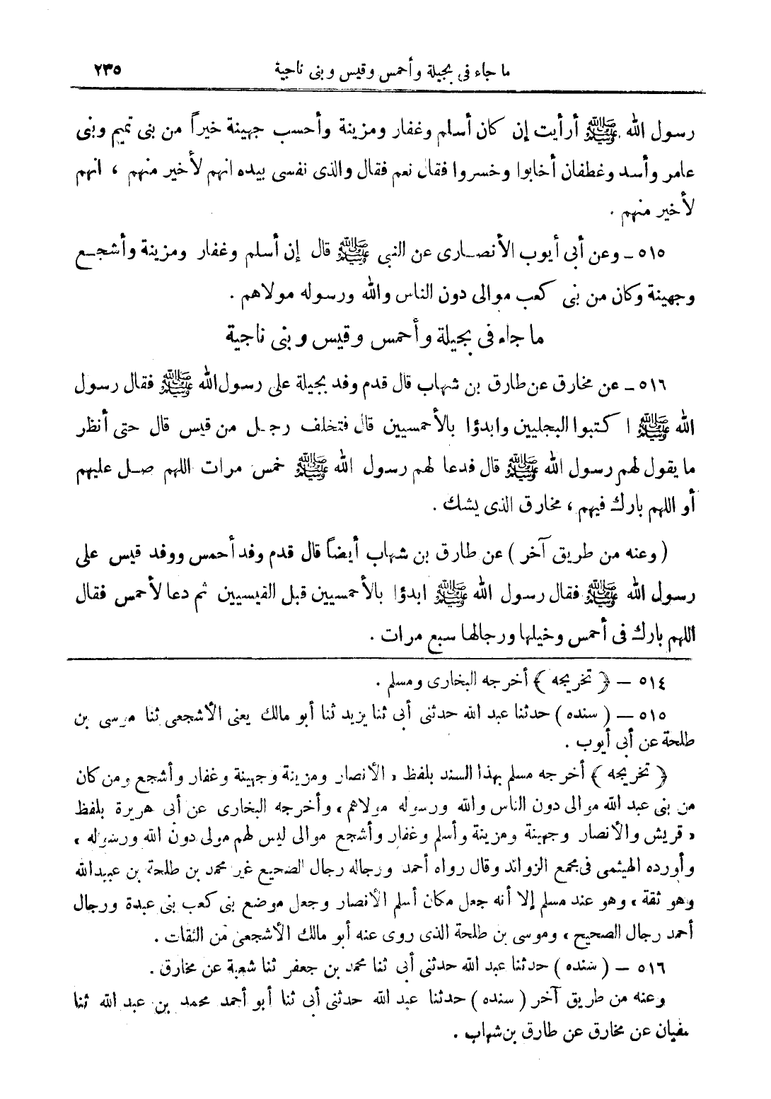 (وعنه من طريق آخر) عن طارق بن شهاب أيضًا قال قدم وفد أحمس ووفد قيس على رسول الله (صلى الله عليه وسلم) ابدؤوا بالاحمسيين قبل القيسيين ثم دعا لأحمس فقال اللهم بارك في أحمس وخيلها ورجالها سبع مرات.