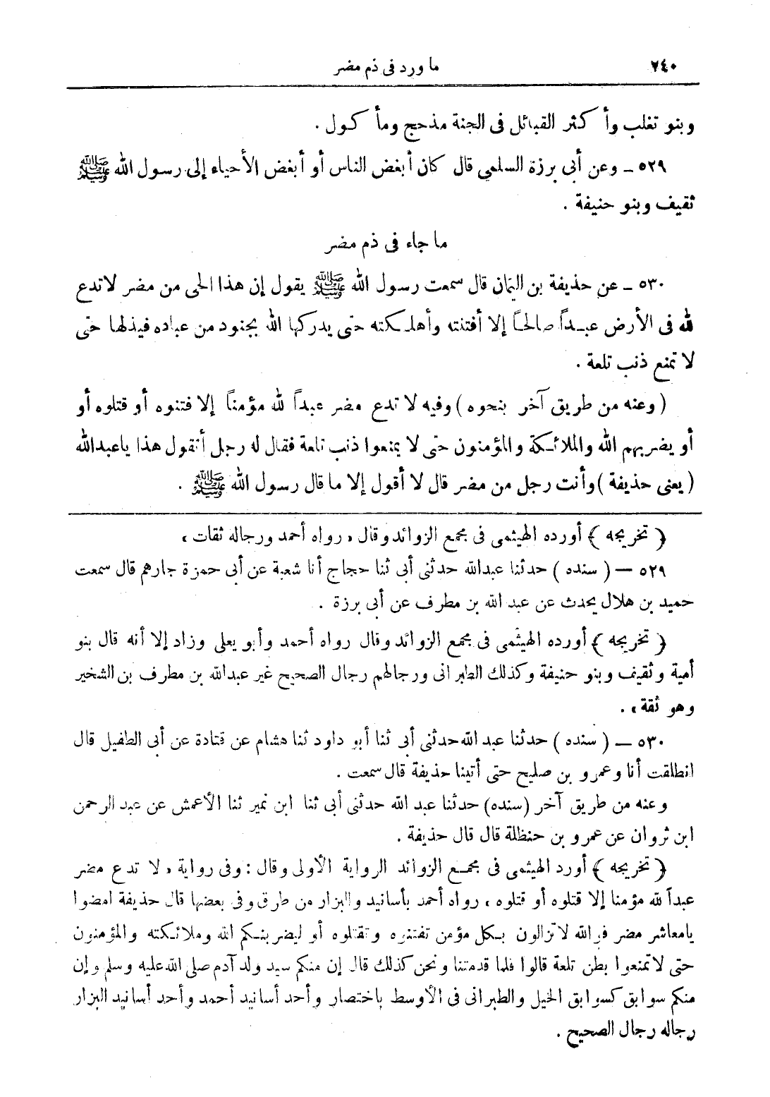 530 - عن حذيفة بن اليمان قال سمعت رسول الله (صلى الله عليه وسلم) يقول إن هذا الحي من مضر لا تدع لله في الأرض عبدًا صالحاًا إلا أفتتنه وأهلكته حتى يدركها الله بجنود من عباده فيذلها حتى لا تمنع ذنب تلعه.