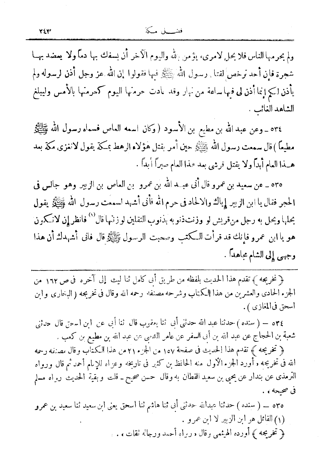 535 - عن سعيد بن عمر وقال أنى عبد الله بن عمرو بن العاص بن الزبير وهو جالس في الحجر فقال يا ابن الزبير إياك والإلحاد في حرم الله فإني أشهد لسمعت رسول الله (صلى الله عليه وسلم) يقول يحلها ويحل به رجل من قريش لو وزنت ذنوبه بذنوب الثقلين لوزنها قال (1) فأنظر إن لا تكون هو يا ابن عمرو فإنك قد قرأت الكتب وصحبت الرسول (صلى الله عليه وسلم) قال فإني أشهدك أن هذا وجهي إلى الشام مجاهدًا.