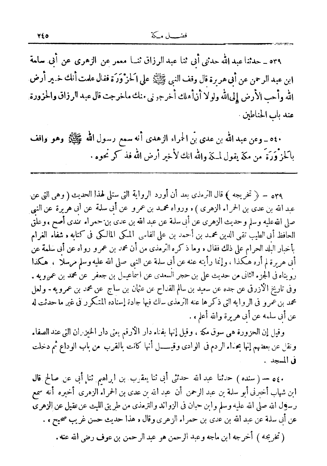 539 - (تخريجه) قال الترمذي بعد أن أورد الرواية التي ستلى لهذا الحديث (وهي التي عن عبد الله بن عدي بن الحمراء الزهري)، "ورواه محمد بن عمرو عن أبى سلمة عن أبى هريرة عن النبي (صلى الله عليه وسلم) وحديث الزهري عن أبى سلمة عن عبد الله بن عدي بن حمراء عندي أصح" وعلق الحافظ أبى الطيب تقي الدين محمد بن أحمد بن على الفاسي المكي المالكي في كتابه "شفاء الغرام بأخبار البلد الحرام على ذلك فقال "وما ذكره الترمذي من أن محمد بن عمرو رواه عن أبى سلمة عن أبى هريرة لم أره هكذا، وإنما رأيته عنه أبى سلمة عن النبي (صلى الله عليه وسلم) مرسلاً، هكذا رويناه في الجزء الثاني من حديث علىبن حجر السعدي عن إسماعيل بن جعفر عن محمد بن عمرو به. وفي تاريخ الأزرقي عن جده عن سعيد بن سالم القداح عن عثمان بن ساج عن محمد بن عمرو به - ولعل محمد بن عمرو في الرواية التي ذكرها عنه الترمذي سلك فيها جادة إسناده المتكرر في غير ما حدثت له عن أبى سلمة عن أبى هريرة والله أعلم.