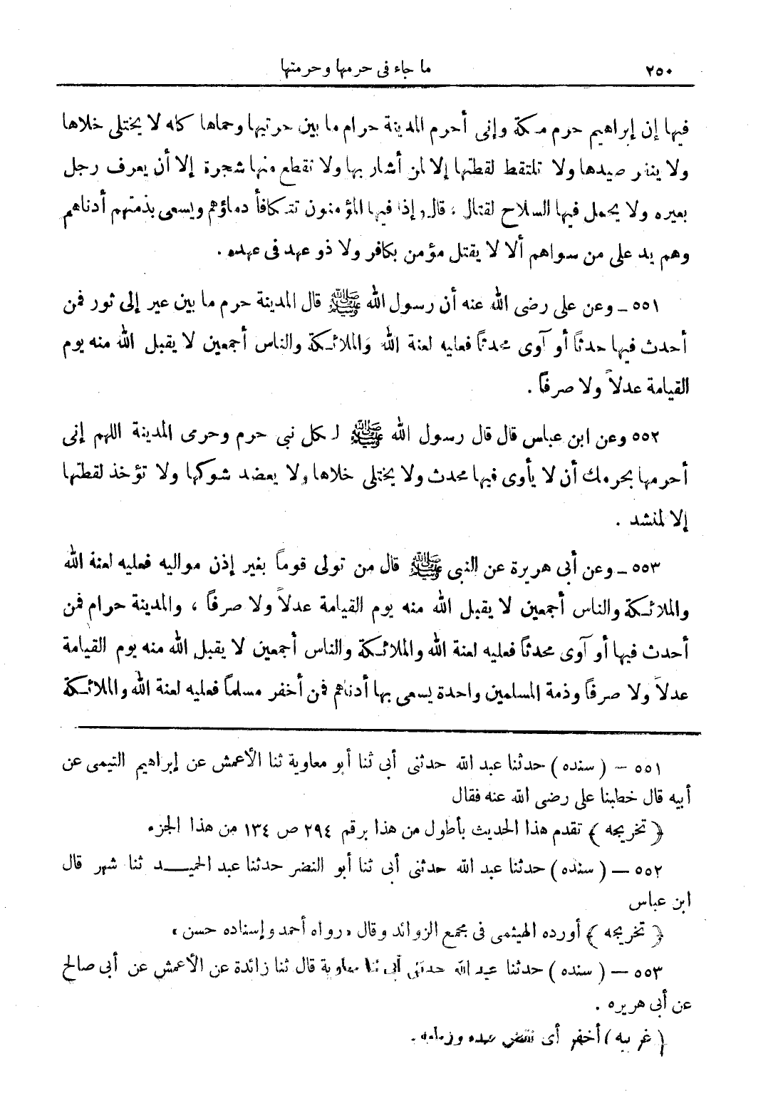 551 - وعن على رضي الله عنه أن رسول الله (صلى الله عليه وسلم) قال المدينة حرم ما بين عير إلى ثور فمن أحدث فيها حدثًا أو آوي محدثًا فعليه لعنة الله والملائكة والناس أجمعين لا يقبل الله منه يوم القيامة عدلاً ولا صرفًا.