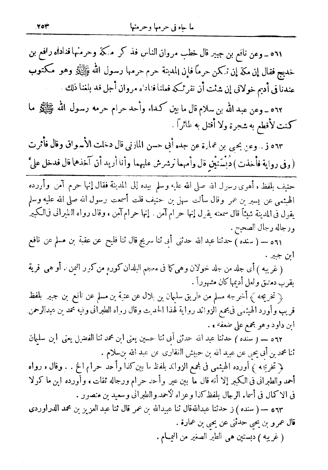 561 - عَنْ نَافِعِ بْنِ جُبَيْرٍ قَالَ خَطَبَ مَرْوَانُ النَّاسَ فَذَكَرَ مَكَّةَ وَحُرْمَتَهَا فَنَادَاهُ رَافِعُ بْنُ خَدِيجٍ فَقَالَ إِنَّ مَكَّةَ إِنْ تَكُنْ حَرَمًا فَإِنَّ الْمَدِينَةَ حَرَمٌ حَرَّمَهَا رَسُولُ اللَّهِ صَلَّى اللَّهُ عَلَيْهِ وَسَلَّمَ وَهُوَ مَكْتُوبٌ عِنْدَنَا فِي أَدِيمٍ خَوْلَانِيٍّ إِنْ شِئْتَ أَنْ نُقْرِئَكَهُ فَعَلْنَا فَنَادَاهُ مَرْوَانُ أَجَلْ قَدْ بَلَغَنَا ذَلِكَ