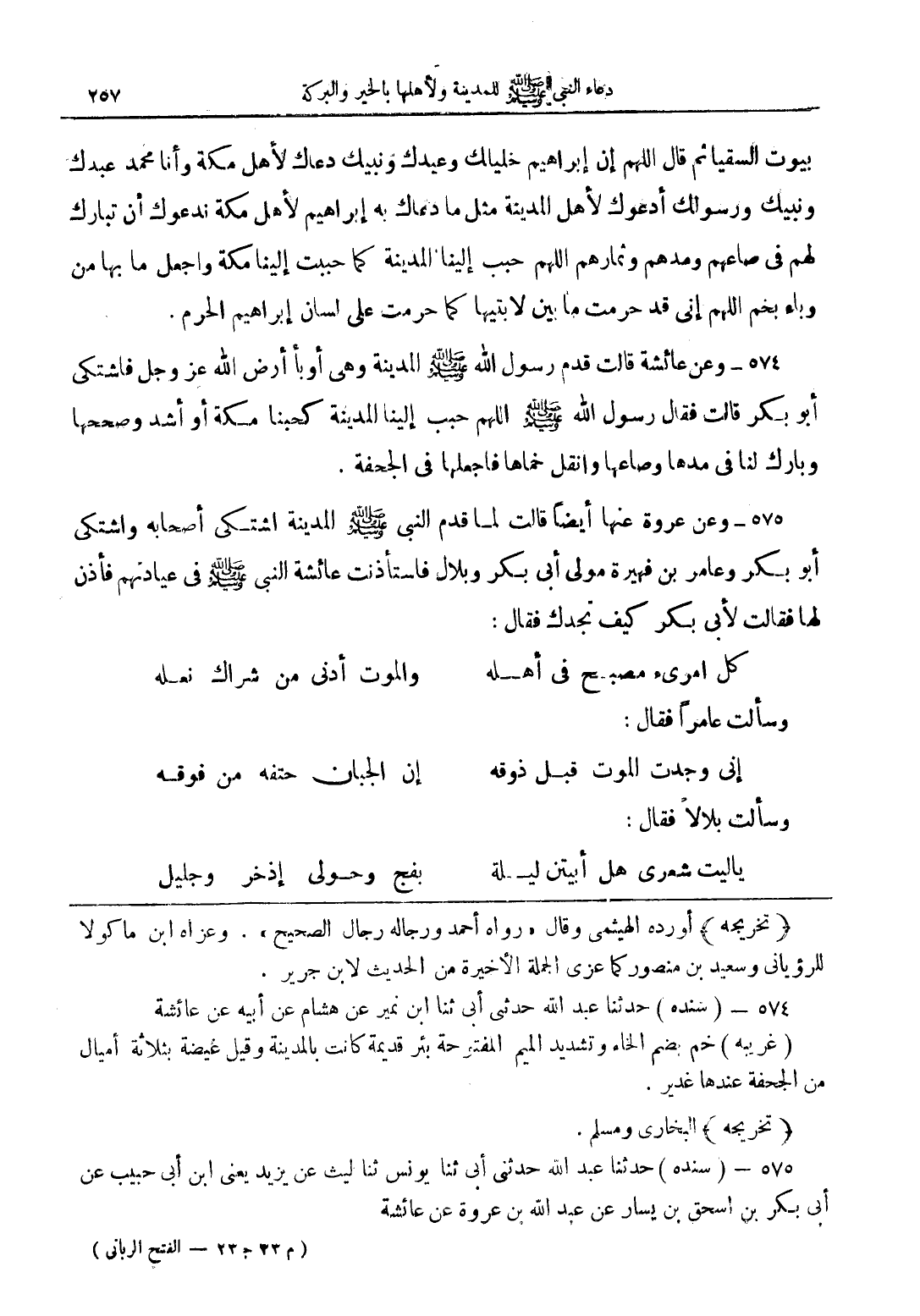 574 - عَنْ عَائِشَةَ قَالَتْ قَدِمَ رَسُولُ اللَّهِ صَلَّى اللَّهُ عَلَيْهِ وَسَلَّمَ الْمَدِينَةَ وَهِيَ أَوْبَأُ أَرْضِ اللَّهِ عَزَّ وَجَلَّ فَاشْتَكَى أَبُو بَكْرٍ قَالَتْ فَقَالَ رَسُولُ اللَّهِ صَلَّى اللَّهُ عَلَيْهِ وَسَلَّمَ اللَّهُمَّ حَبِّبْ إِلَيْنَا الْمَدِينَةَ كَحُبِّنَا مَكَّةَ أَوْ أَشَدَّ وَصَحِّحْهَا وَبَارِكْ لَنَا فِي مُدِّهَا وَصَاعِهَا وَانْقُلْ حُمَّاهَا فَاجْعَلْهَا فِي الْجُحْفَةِ