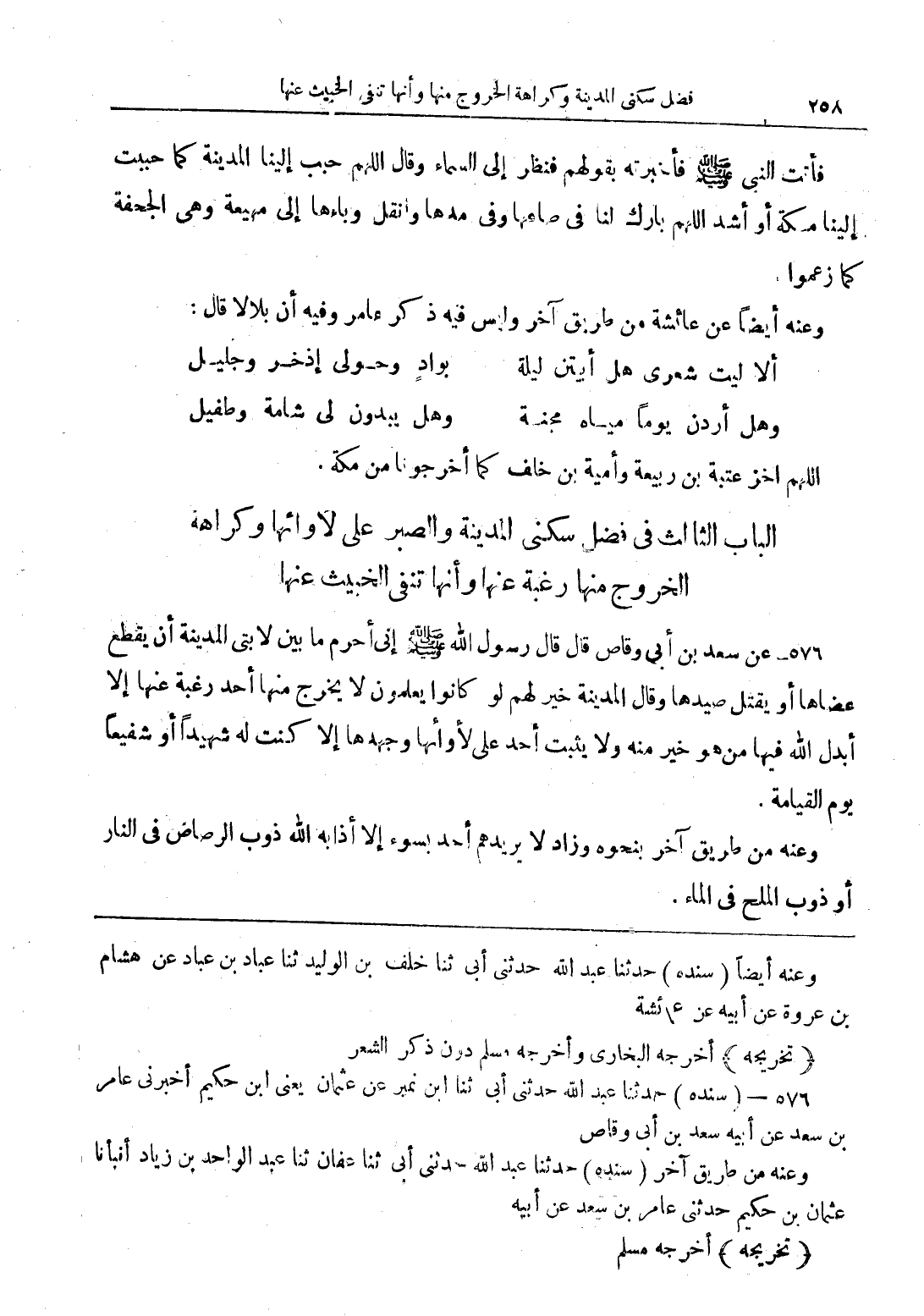 576 - عَن سَعْدٍ قَالَ قَالَ رَسُولُ اللَّهِ صَلَّى اللَّهُ عَلَيْهِ وَسَلَّمَ إِنِّي أُحَرِّمُ مَا بَيْنَ لَابَتَيْ الْمَدِينَةِ أَنْ يُقْطَعَ عِضَاهَا أَوْ يُقْتَلَ صَيْدُهَا وَقَالَ الْمَدِينَةُ خَيْرٌ لَهُمْ لَوْ كَانُوا يَعْلَمُونَ لَا يَخْرُجُ مِنْهَا أَحَدٌ رَغْبَةً عَنْهَا إِلَّا أَبْدَلَ اللَّهُ فِيهَا مَنْ هُوَ خَيْرٌ مِنْهُ وَلَا يَثْبُتُ أَحَدٌ عَلَى لَأْوَائِهَا وَجَهْدِهَا إِلَّا كُنْتُ لَهُ شَهِيدًا أَوْ شَفِيعًا يَوْمَ الْقِيَامَةِ