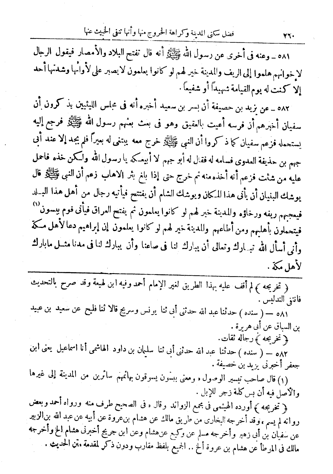 581 - وعنه في أخرى عن رسول الله صلى الله عليه وسلم أنه قال تفتح البلاد والأمصار فيقول الرجال لإخوانهم هلموا إلى الريف والمدينة خير لهم لو كانوا يعلمون لا يصبر على لأوائها وشدتها أحد إلا كنت له يوم القيامة شهيدا أو شفيعا