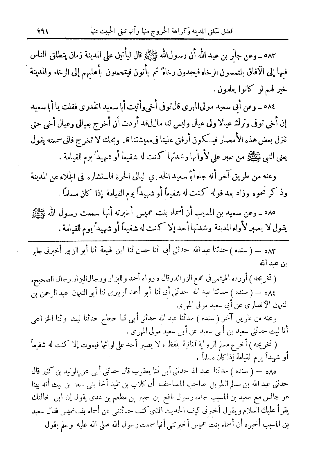 وعنه من طريق آخر أنه جاء أبا سعيد الخدري ليالي الحرة فاستشاره في الجلاء عن المدينة وذكر نحوه وزاد بعد قوله كنت له شفيعا أو شهيدا يوم القيامة إذا كان مسلما