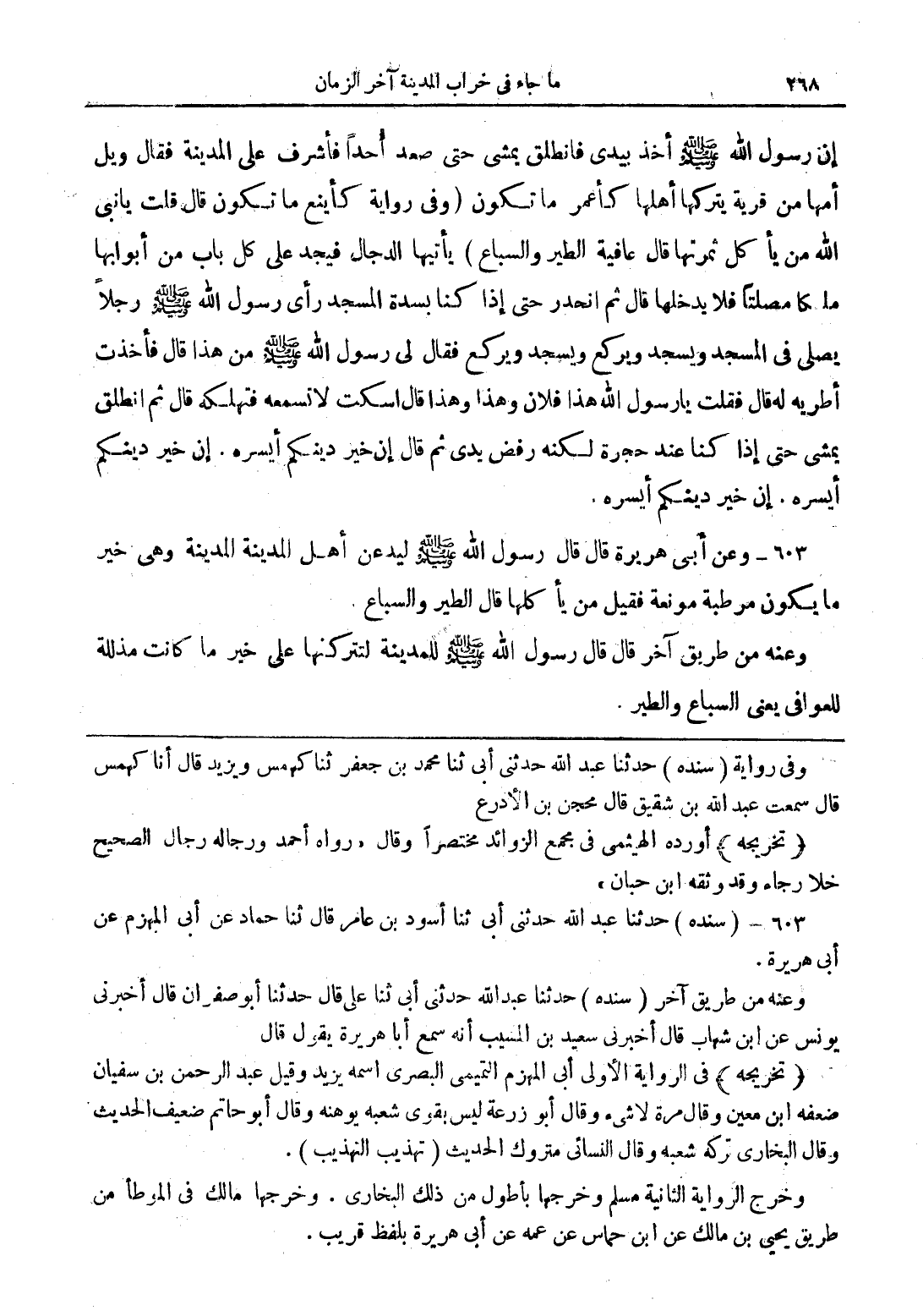 603 - وعن أبي هريرة قال قال رسول الله صلى الله عليه وسلم ليدعن أهل المدينة المدينة وهي خير ما يكون مرطبة مونعة فقيل من يأكلها قال الطير والسباع