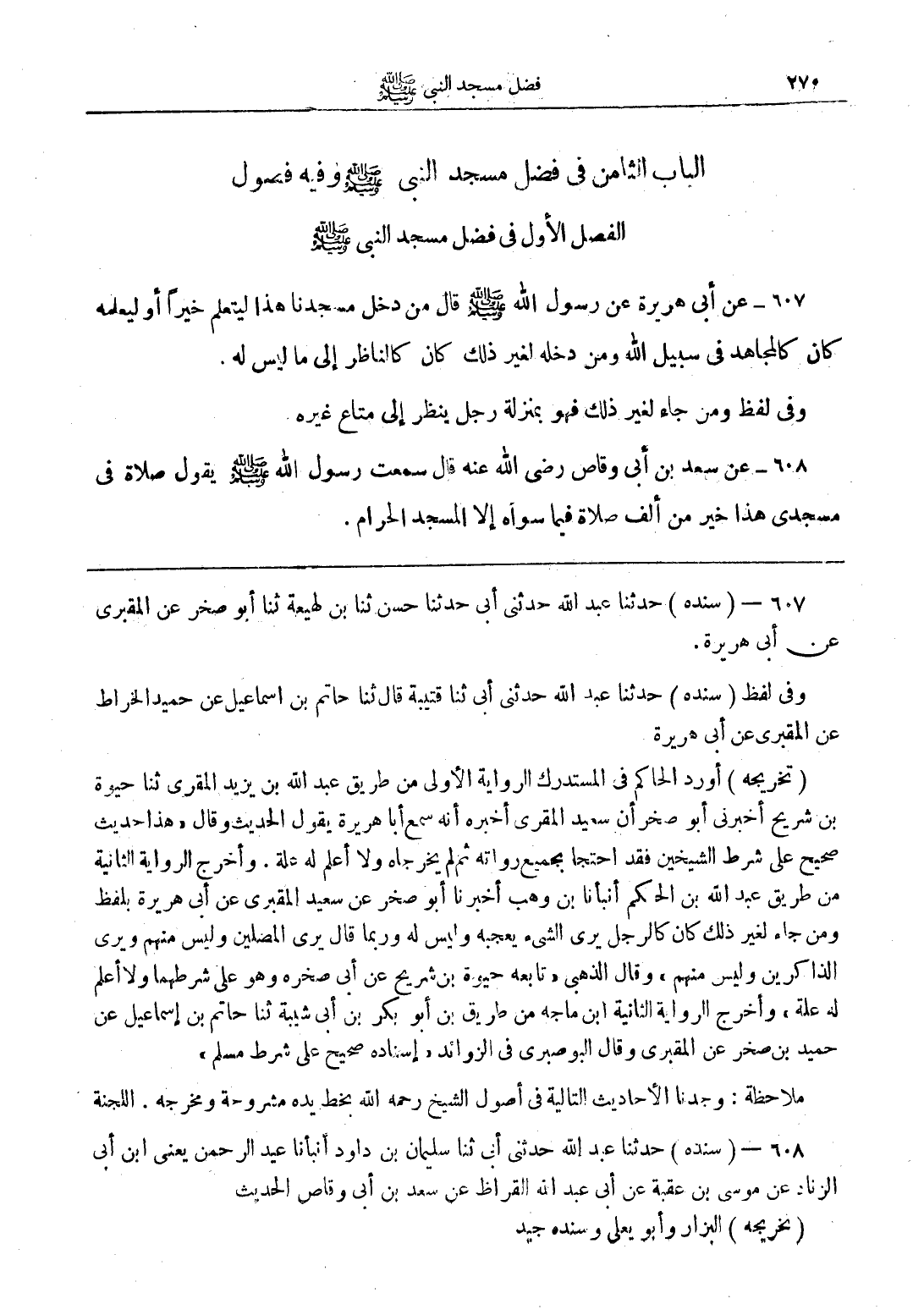 607 - عن أبي هريرة عن رسول الله صلى الله عليه وسلم قال من دخل مسجدنا هذا ليتعلم خيرا أو ليعلمه كان كالمجاهد في سبيل الله ومن دخله لغير ذلك كان كالناظر إلى ما ليس له