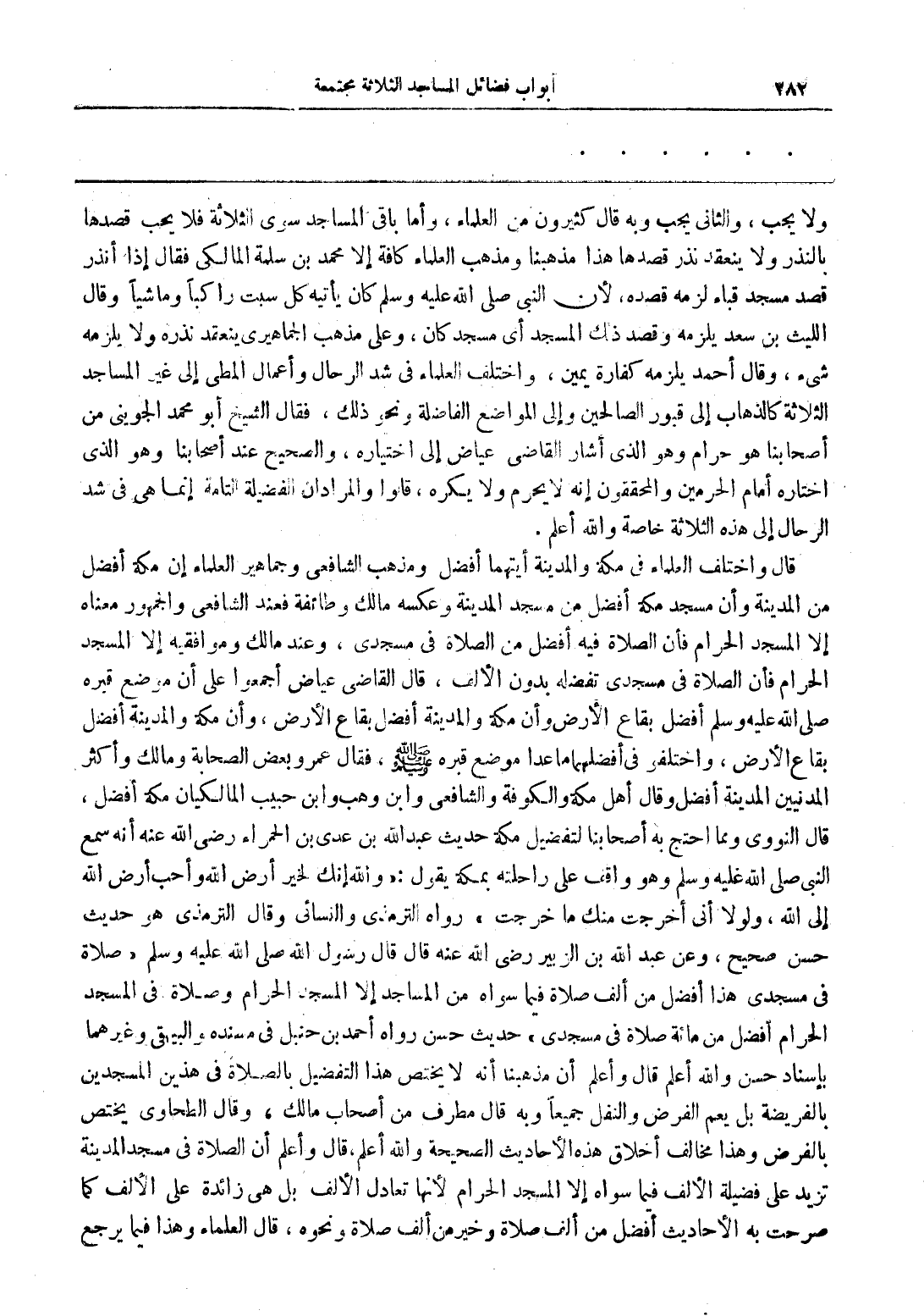 ولا يجب والثاني يجب وبه قال كثيرون من العلماء وأما باقي المساجد سوى الثلاثة فلا يجب قصدها بالنذر ولا ينعقد نذر قصدها هذا مذهبنا ومذهب العلماء كافة إلا محمد بن سلمة المالكي فقال إذا أنذر قصد مسجد قباء لزمه قصده لأن النبي صلى الله عليه وسلم كان يأتيه كل سبت راكبا وماشيا وقال الليث بن سعد يلزمه وقصد ذلك المسجد أي مسجد كان وعلى مذهب الجماهيري ينعقد نذره ولا يلزمه شيء وقال أحمد يلزمه كفارة يمين واختلف العلماء في شد الرحال وأعمال المطي إلى غير المساجد الثلاثة كالذهاب إلى قبور الصالحين وإلى المواضع الفاضلة ونحو ذلك فقال الشيخ أبو محمد الجويني من أصحابنا هو حرام وهو الذي أشار القاضي عياض إلى اختياره والصحيح عند أصحابنا وهو الذي اختاره إمام الحرمين والمحققون أنه لا يحرم ولا يكره قالوا والمراد أن الفضيلة التامة إنما هي في شد الرحال إلى هذه الثلاثة خاصة والله أعلم