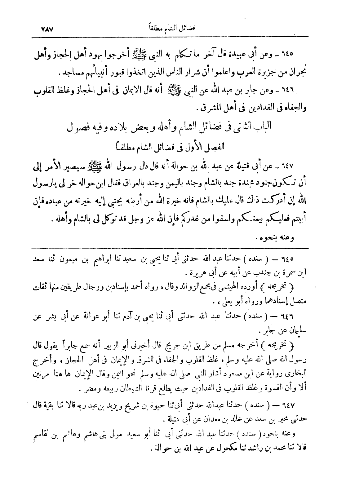 647 - (سنده) حدثنا عبد الله حدثني أبي ثنا حيوة بن شريح ويزيد بن عبد ربه قالا ثنا بقية قال حدثني محير بن سعد عن خالد بن معدان عن أبي قتيلة.