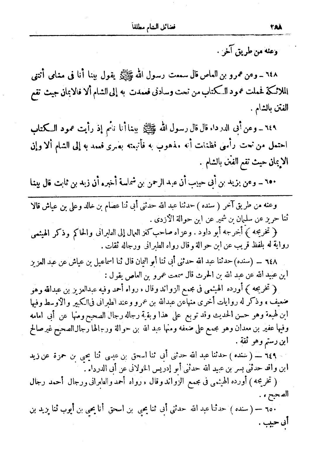 648 - وعن عمرو بن العاص قال سمعت رسول الله صلى الله عليه وسلم يقول بينا أنا في منامي أتتني الملائكة فحملت عمود الكتاب من تحت وسادتي فعمدت به إلى الشام ألا فالإيمان حيث تقع الفتن بالشام