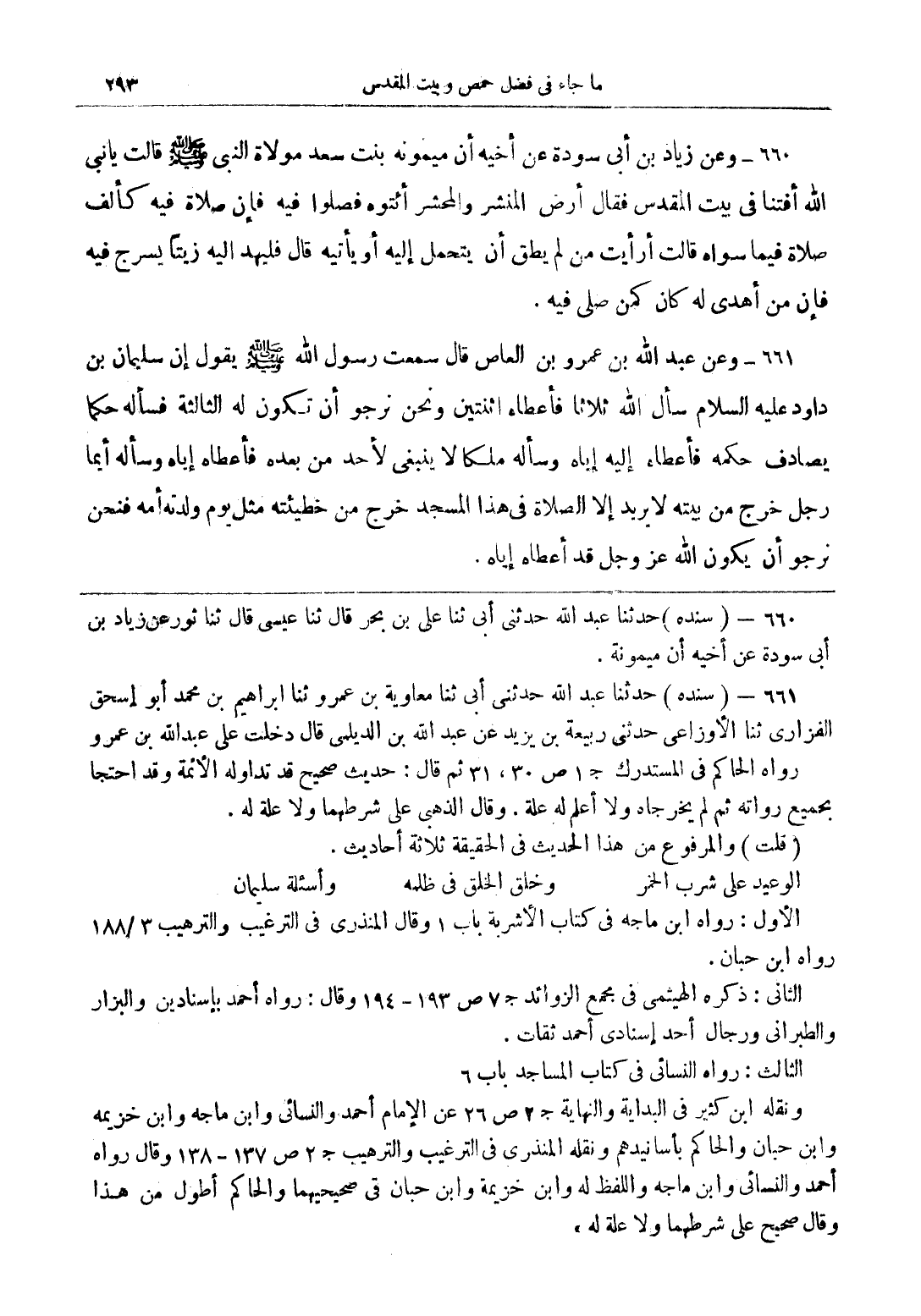 660 - وعن زياد بن أبي سودة عن أخيه أن ميمونة بنت سعد مولاة النبي صلى الله عليه وسلم قالت يا نبي الله أفتنا في بيت المقدس فقال أرض المنشر والمحشر ائتوه فصلوا فيه فإن صلاة فيه كألف صلاة فيما سواه قالت أرأيت من لم يطق أن يتحمل إليه أو يأتيه قال فليهد إليه زيتا يسرج فيه فإن من أهدى له كان كمن صلى فيه
