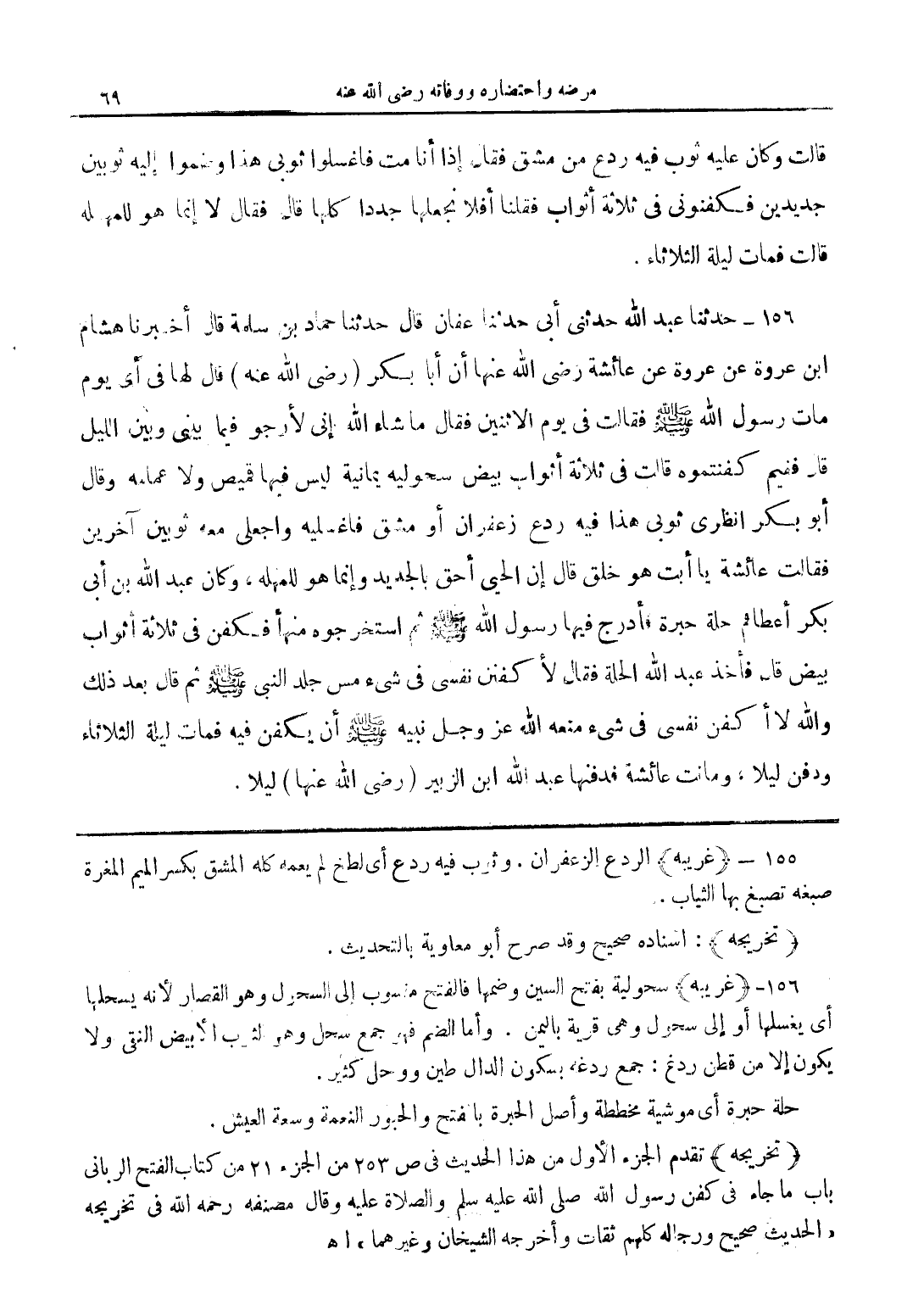 156 - حدثنا عبد الله حدثني أبي حدثنا حماد بن سلمة قال أخبرنا هشام بن عروة عن عروة عن عائشة رضي الله عنها أن أبا بكر (رضي الله عنه) قال لها في أي يوم مات رسول الله صلى الله عليه وسلم فقالت في يوم الاثنين فقال ما شاء الله إني لأرجو فيما بيني وبين الليل قال ففيم كفنتموه قالت في ثلاثة أثواب بيض سحولية يمانية ليس فيها قميص ولا عمامة وقال أبو بكر انظري ثوبي هذا فيه ردع زعفران أو مشق فاغسليه واجعلي معه ثوبين آخرين فقالت عائشة يا أبت هو خلق قال إن الحي أحق بالجديد وإنما هو للمهلة وكان عبد الله بن أبي بكر أعطاهم حلة حبرة فأدرج فيها رسول الله صلى الله عليه وسلم ثم استخرجوه منها فكفن في ثلاثة أثواب بيض قال فأخذ عبد الله الحلة فقال لأكفنن نفسي في شيء مس جلد النبي صلى الله عليه وسلم ثم قال بعد ذلك والله لا أكفن نفسي في شيء منعه الله عز وجل نبيه صلى الله عليه وسلم أن يكفن فيه فمات ليلة الثلاثاء ودفن ليلا وماتت عائشة فدفنها عبد الله بن الزبير (رضي الله عنها) ليلا.