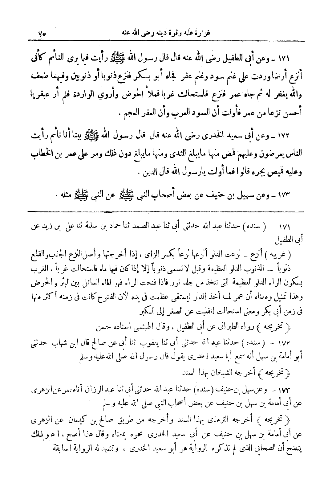 171 - وعن أبي الطفيل رضي الله عنه قال قال رسول الله صلى الله عليه وسلم رأيت فيما يرى النائم كأنى أنزع أرضا وردت على غنم سود وغنم فجاء أبو بكر فنزع ذنوبا أو ذنوبين وفيهما ضعف والله يغفر له ثم جاء عمر فنزع فاستحالت غربا فملأ الحوض وأوري الواردة فلم أر عبقريا أحسن نزعا من عمر فأولت أن السود العرب وأن العفر العجم.
