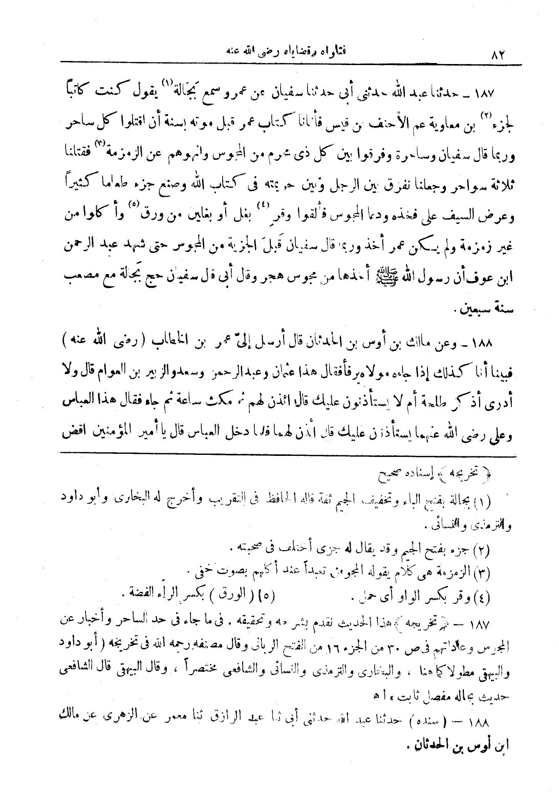187 - حدثنا عبد الله حدثني أبي حدثنا سفيان عن عمرو سمع بجالة (1) يقول كنت كاتباً لجزء (2) بن معاوية عم الأحنف بن قيس فأنا كتاب عمر قبل موته بسنة أن اقتلوا كل ساحر وربما قال سفيان وساحرة وفرقوا بين كل ذى محرم من المجوس وانهوهم عن الزمزمة (3) فقتلنا ثلاثة سواحر وجعلنا نفرق بين الرجل وبين جريمته فى كتاب الله وصنع جزء طعاما كثيراً وعرض السيف على فخذه ودعا المجوس فألقوا وقر (4) بغل أو بغلين من ورق (5) وأكلوا من غير زمزمة ولم يكن عمر أخذ وربما قال سفيان قبل الجزية من المجوس حتى شهد عبد الرحمن بن عوف أن رسول الله صلى الله عليه وسلم أخذها من مجوس هجر وقال أبى قال سفيان حج بجالة مع مصعب سنة سبعين.