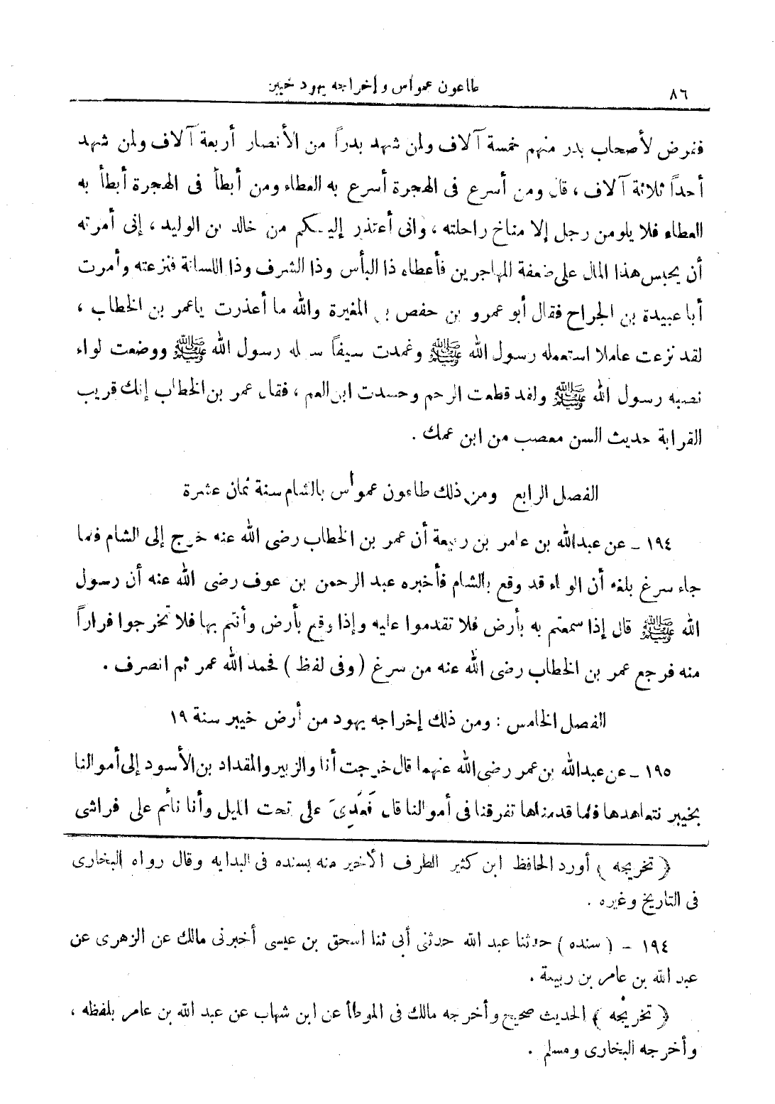 195 - عن عبد الله بن عمر رضي الله عنهما قال خرجت أنا والزبير والمقداد بن الأسود إلى أموالنا بخيبر نتعاهدها فلما قدمناها تفرقنا فى أموالنا قال فَعّدِىِ على تحت الليل وأنا نائم على فراشي