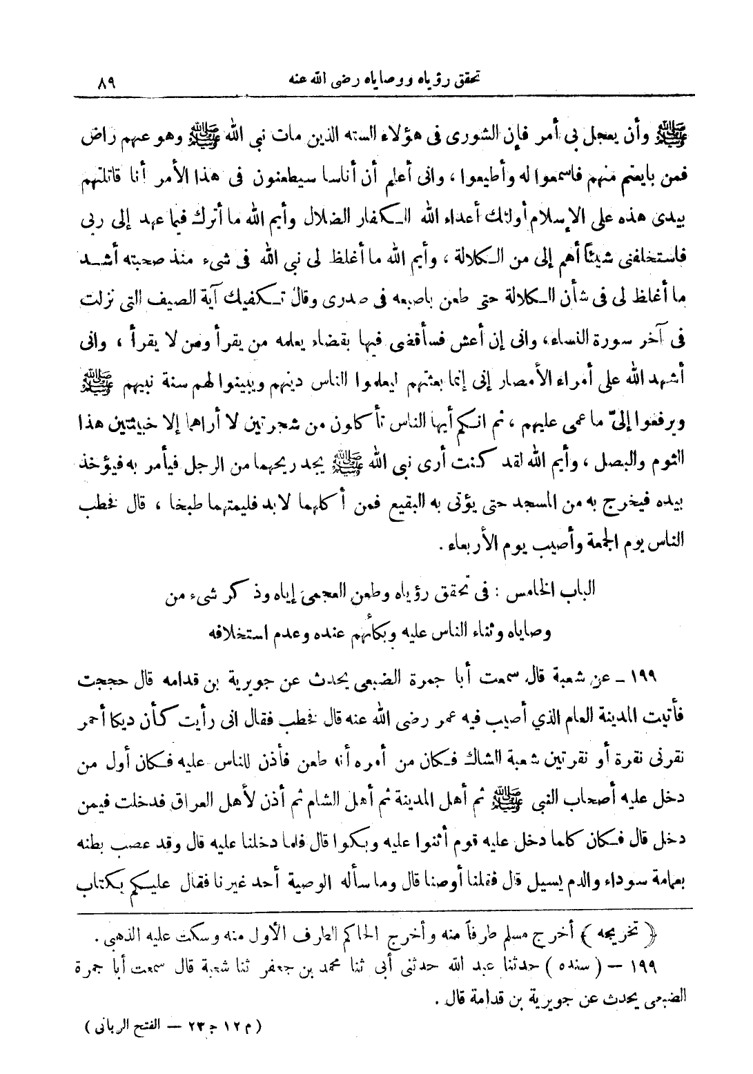 199 - عن شعبة قال سمعت أبا جمرة الضيعى يحدث عن جويرية بن قدامه قال حجبت فأتيت المدينة العام الذي أصيب فيه عمر رضي الله عنه قال فخطب فقال انى رأيت كأن ديكا أحمر نقرنى نقرة أو نقرتين شعبة الشاك فكان من أمره أنه طعن فأذن للناس عليه فكان أول من دخل عليه أصحاب النبى صلى الله عليه وسلم ثم أهل الشام ثم أذن لأهل العراق فدخلت فيمن دخل قال فكان كلما دخل عليه قوم أثنوا عليه وبكوا قال فلما دخلنا عليه قال وقد عصب بطنه بعمامة سوداء والدم يسيل قال فقلنا أوصنا قال وما سأله الوصية أحد غيرنا فقال عليكم بكتاب