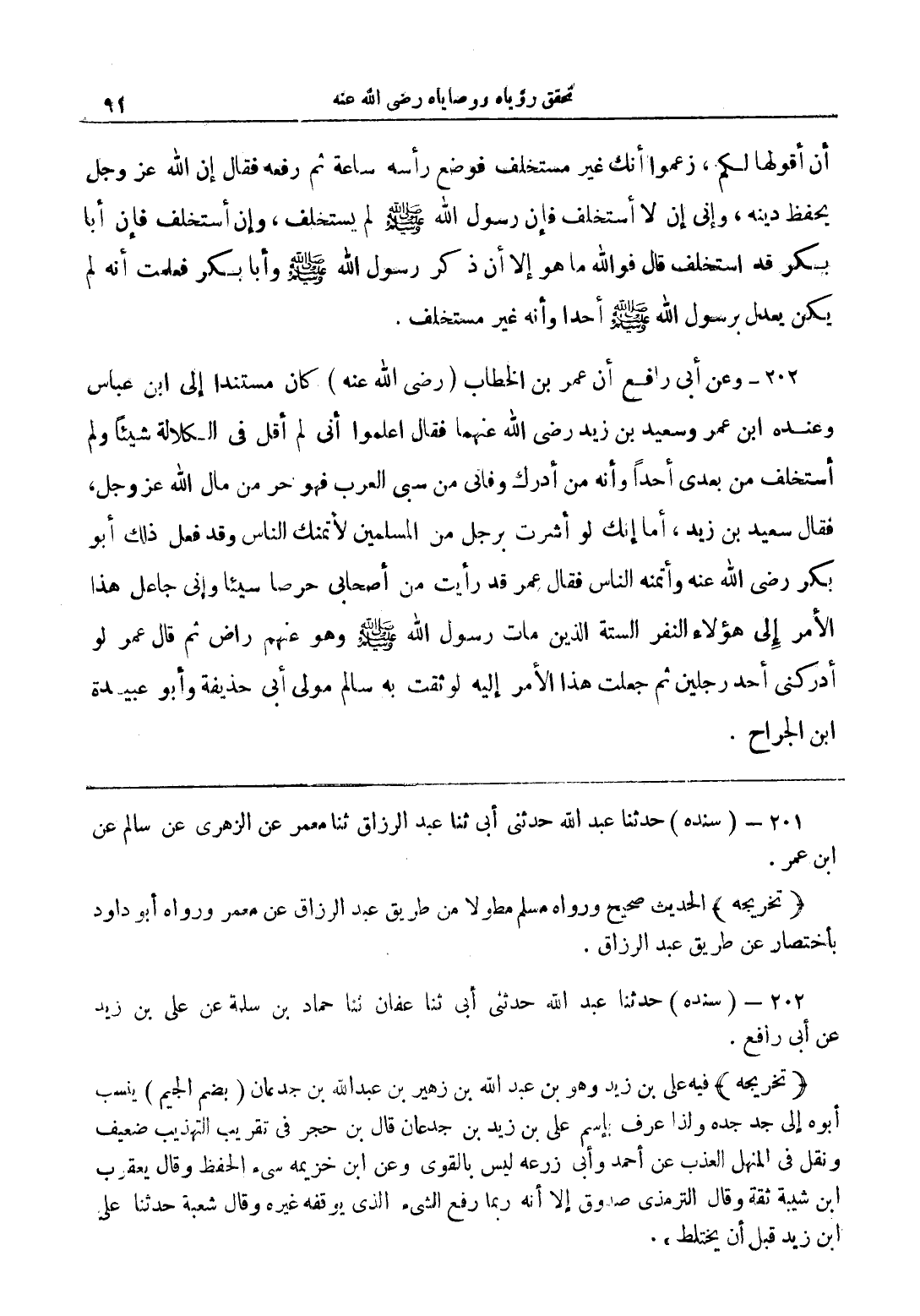 202 - وعن أبى رافع أن عمر بن الخطاب (رضي الله عنه) كان مسنداً إلى ابن عباس وعنده ابن عمر وسعيد بن زيد رضي الله عنهما فقال اعلموا أنى لم أقل فى الكلالة شيئاً ولم أستخلف من بعدى أحداً وأنه من أدرك وفانى من سبى العرب فهو حر من مال الله عز وجل، فقال سعيد بن زيد، أما إنك او أشرت برجل من المسلمين لأتمنك الناس وقد فعل ذلك أبو بكر صلى الله عليه وسلم وأتمنه الناس فقال عمر قد رأيت من أصحابى حرصا سيئا وإنى جاعل هذا الأمر إلى هؤلاء النفر الستة الذين مات رسول الله صلى الله عليه وسلم وهو عنهم راض ثم قال عمر لو أدركنى أحد رجلين ثم جعلت هذا الأمر إليه لوثقت به سالم مولى أبى حذيفة وأبو عبيدة ابن الجراح.