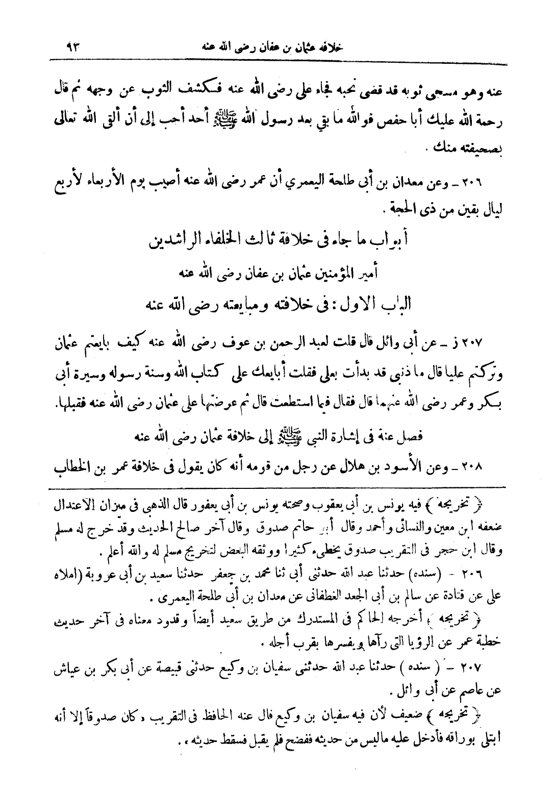 207 ز- عن أبى وائل قال قلت لعبد الرحمن بن عوف رضي الله عنه كيف بايعتم عثمان وتركتم عليا قال ما ذنبى قد بدأت بعلى فقلت أبايعك على كتاب الله وسنة رسوله وسيرة أبى بكر وعمر رضي الله عنهما قال فقال فيما استطعت قال ثم عرضتها على عثمان رضي الله عنهما فقبلها.