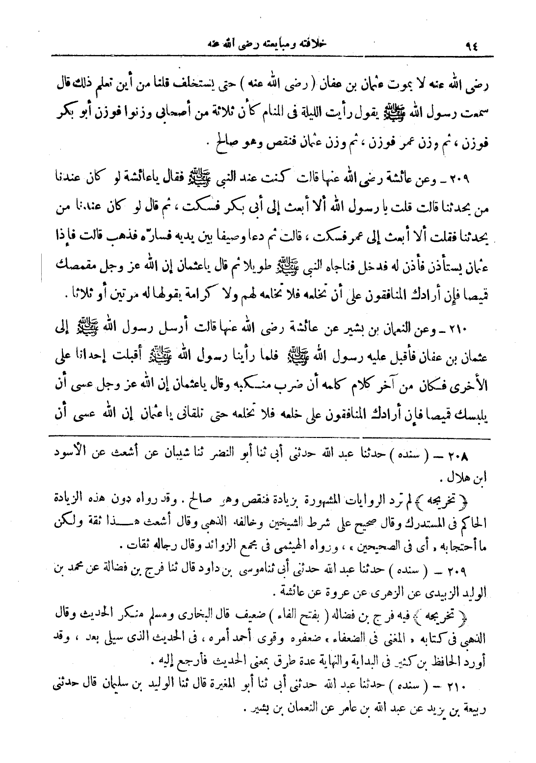 210 - وعن النعمان بن يشير عن عائشة رضي الله عنها قالت أرسل رسول الله صلى الله عليه وسلم إلى عثمان بن عفان فأقبل عليه رسول الله صلى الله عليه وسلم فلنا رأينا رسول الله صلى الله عليه وسلم أقبلت إحدانا على الأخرى فكان من آخر كلام كلمة أن ضرب منكبه وقال يا عثمان إن الله عز وجل عسى أن يلبسك قميصا فإن أرادك المنافقون على خلعه حتى تلقانى يا عثمان إن الله عسى أن