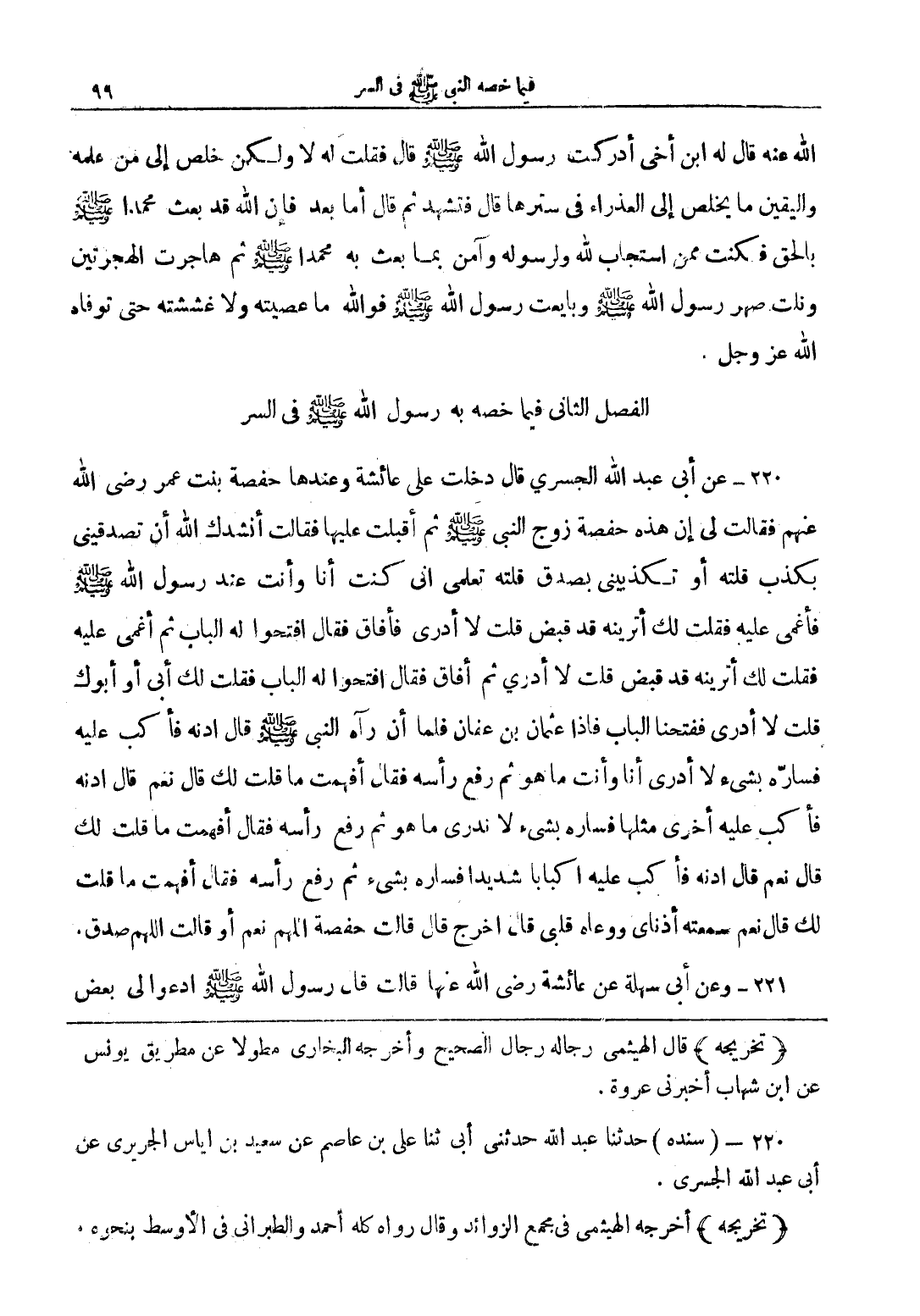 220 - عن أبى عبد الله الجسري قال دخلت على عائشة وعندها حفصة بنت عمر رضي الله عنهم فقالت لى إن هذه حفصة زوج النبى صلى الله عليه وسلم ثم أقبلت عليها فقالت أنشدك الله أن تصدقينى بكذب قلته أو تكذبينى بصدق قلته تعلمى أنى كنت أنا وأنت عند رسول الله صلى الله عليه وسلم فأغمى عليه فقلت له أترينه قد قبض قلت لا أدرى فأناف فقال افتحوا له الباب ثم أغمى عليه فقلت لك أترينه قد قبض قلت لا أدري ثم أفاق فقال افتحوا له الباب فقلت لك أبى أو أبوك قلت لا أدرى ففتحنا الباب فإذا عثمان بن عفان فلما أن رآه النبى صلى الله عليه وسلم قال ادنه فأكب عليه فسارّه بشئ لا أدرى أنا وأنت ما هو ثم رفع رأسه فقال أفهمت ما قلت لك قال نعم قال ادنه فأكب عليه أخرى مثلها فساره بشئ لا ندرى ما هو ثم رفع رأسه فقال أفهمت ما قلت لك قال نعم قال ادنه فأكب عليه اكبابا شديدا فساره بشئ ثم رفع رأسه فقال أفهمت ما قلت لك قال نعم سمعته أذناى ووعاه قلبى قال اخرج قال قالت حفصة اللهم نعم أو قالت اللهم صدق.