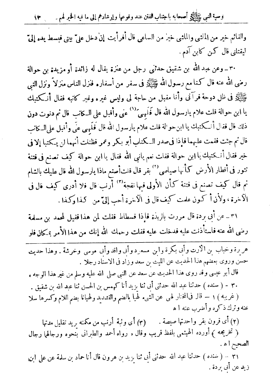 30 - وعن عبد الله بن شقيق حدثنى رجل من عنزة يقال له زائدة أو مزيدة بن حوالة رضي الله عنه قال كنا مع رسول الله صلى الله عليه وسلم فى سفر من أسفاره فنزل الناس منزلاً ونزل النبى صلى الله عليه وسلم فى ظل دوحة فرآنى وأنا مقبل من حاجة لى وليس غيره وغير كاتبه فقال أنكتبك يا ابن حوالة قلت علام يا رسول الله قال فلهنى (1) عنى وأقبل على الكاتب قال ثم دنوت دون ذلك قال فقال أنكتبك يا ابن حوالة قلت علام يا رسول الله قال فلهمنى عنّى وأقبل على الكاتب قال ثم جئت فقمت عليهما فإذا فى صدر الكتاب أبو بكر وعمر فظننت أنهما لن يكتبا إلا فى خير فقال أنكتبك يا ابن حوالة فقلت نعم يا نبى الله فقال يا ابن حوالة كيف تصنع فى فتنة تثور فى أقطار الأرض كأنها صياصى (2) بقر قال قلت أصنع ماذا يا رسول الله قال عليك بالشام ثم قال كيف تصنع فى فتنة كأن الأولى فيها نفجة (3) أرنب قال فلا أدرى كيف قال فى الآخرة، ولأن أكون علمت كيف قال فى الآخرة أحب إلىّ من كذا وكذا.