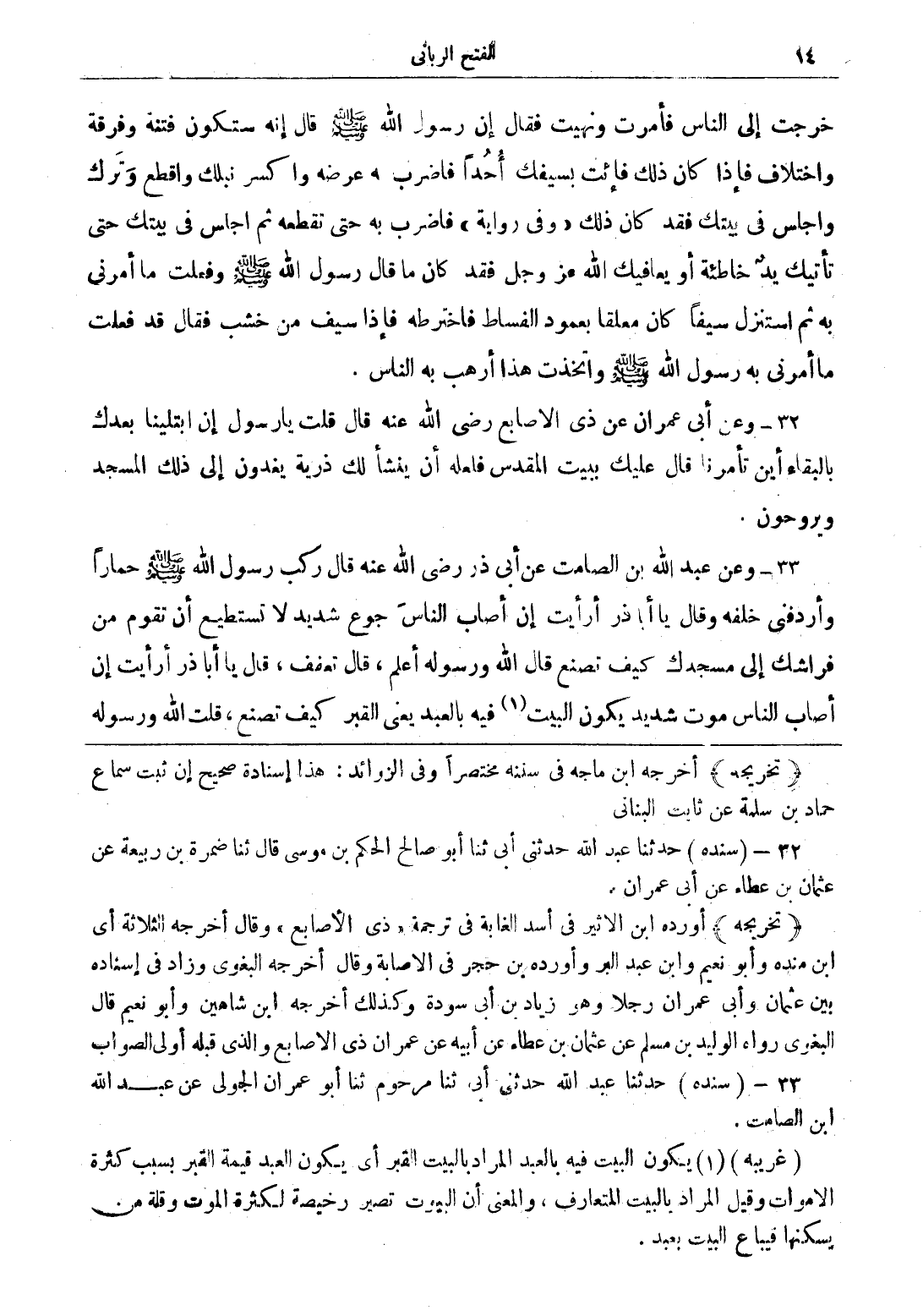 33 - وعن عبد الله بن الصامت عن أبى ذر رضي الله عنه قال ركب رسول الله صلى الله عليه وسلم حمارًا وأردفنى خلفه وقال يا أبا ذر أرأيت إن أصاب الناس جوع شديد لا نستطيع أن تقوم من فراشك إلى مسجدك كيف تصنع قال الله ورسوله أعلم، قال تعفف، قال يا أبا ذر أرأيت إن أصاب الناس موت شديد يكون البيت (1) فيه بالعبد يعنى القبر كيف تصنع، قلت الله ورسوله