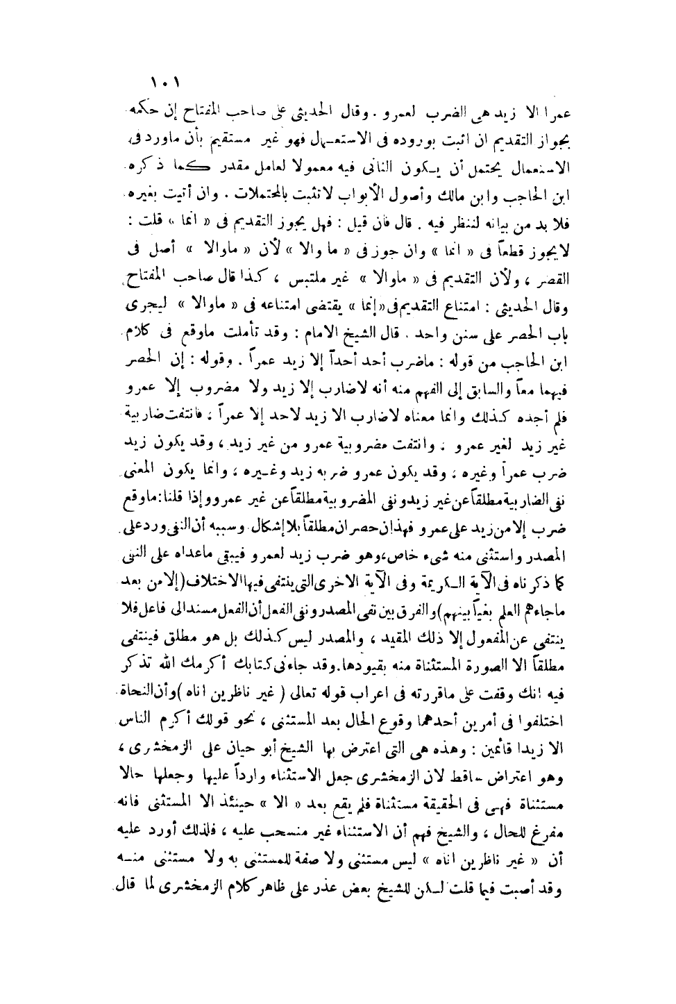 وَقَالَ الْحَدِيثِيُّ عَلَى صَاحِبِ الْمِفْتَاحِ إنَّ حُكْمَهُ بِجَوَازِ التَّقْدِيمِ إنْ أُثْبِتَ بِوُرُودِهِ فِي الِاسْتِعْمَالِ فَهُوَ غَيْرُ مُسْتَقِيمٍ بِأَنْ مَا وَرَدَ فِي الِاسْتِعْمَالِ يَحْتَمِلُ أَنْ يَكُونَ الثَّانِي فِيهِ مَعْمُولًا لِعَامِلٍ مُقَدَّرٍ كَمَا ذَكَرَهُ ابْنُ الْحَاجِبِ وَابْنُ مَالِكٍ وَأُصُولُ الْأَبْوَابِ لَا تَثْبُتُ بِالْمُحْتَمَلَاتِ. وَإِنْ أَتَيْت بِغَيْرِهِ فَلَا بُدَّ مِنْ بَيَانِهِ لِنَنْظُرَ فِيهِ.