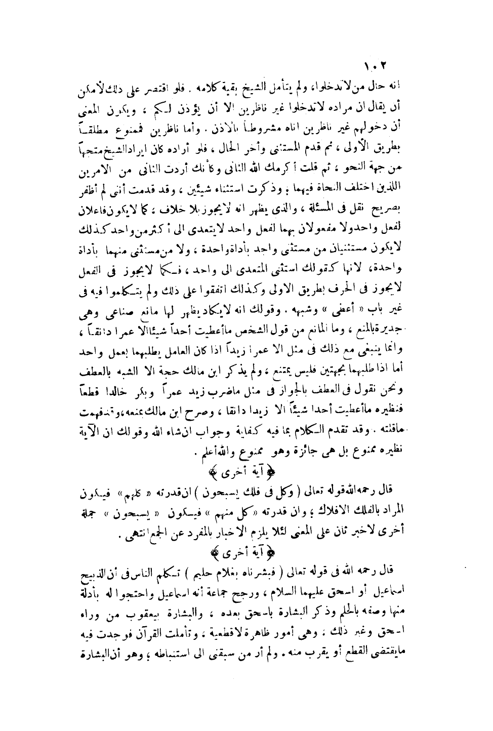 فَلَوْ اقْتَصَرَ عَلَى ذَلِكَ لَأَمْكَنَ أَنْ يُقَالَ إنَّ مُرَادَهُ لَا تَدْخُلُوا غَيْرَ نَاظِرِينَ إلَّا أَنْ يُؤْذَنَ لَكُمْ، وَيَكُونُ الْمَعْنَى أَنَّ دُخُولَهُمْ غَيْرَ نَاظِرِينَ إنَاهُ مَشْرُوطًا بِالْإِذْنِ. وَأَمَّا نَاظِرِينَ فَمَمْنُوعٌ مُطْلَقًا بِطَرِيقِ الْأَوْلَى، ثُمَّ قَدَّمَ الْمُسْتَثْنَى وَأَخَّرَ الْحَالَ، فَلَوْ أَرَادَهُ كَانَ إيرَادُ الشَّيْخِ مُتَّجِهًا مِنْ جِهَةِ النَّحْوِ، ثُمَّ قُلْت أَكْرَمَك اللَّهُ الثَّانِي وَكَأَنَّك أَرَدْت الثَّانِيَ مِنْ الْأَمْرَيْنِ اللَّذَيْنِ اخْتَلَفَ النُّحَاةُ فِيهِمَا؛ وَذَكَرْت اسْتِثْنَاءَ شَيْئَيْنِ.