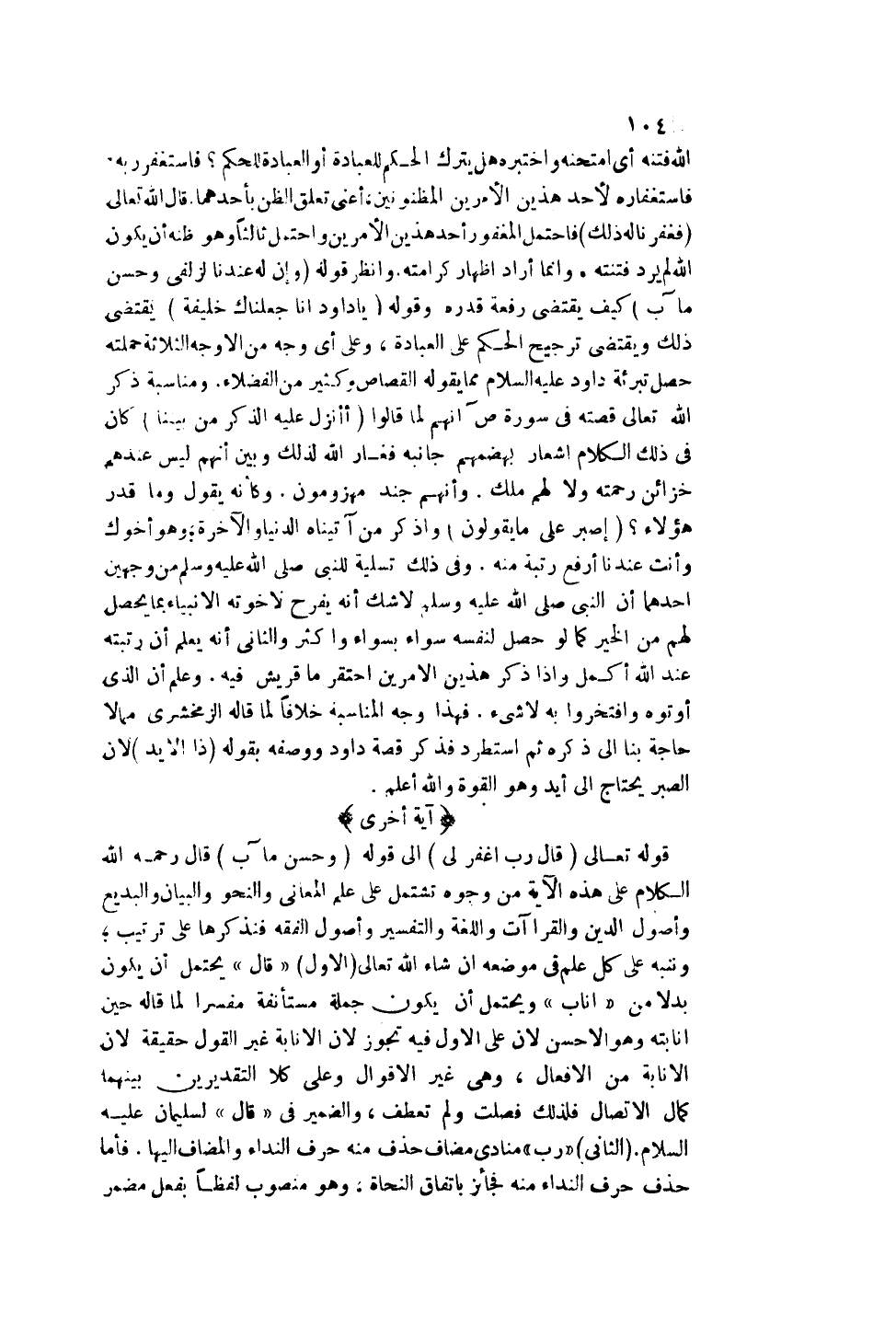 قَوْله تَعَالَى {قَالَ رَبِّ اغْفِرْ لِي} [ص: 35] إلَى قَوْلِهِ {وَحُسْنَ مَآبٍ} [ص: 40] قَالَ - رَحِمَهُ اللَّهُ - الْكَلَامُ عَلَى هَذِهِ الْآيَةِ مِنْ وُجُوهٍ تَشْتَمِلُ عَلَى الْمَعَانِي، وَالنَّحْوِ، وَالْبَيَانِ، وَالْبَدِيعِ، وَأُصُولِ الدِّينِ، وَالْقِرَاءَاتِ، وَاللُّغَةِ وَالتَّفْسِيرِ، وَأُصُولِ الْفِقْهِ فَنَذْكُرُهَا عَلَى تَرْتِيبٍ؛ وَنُنَبِّهُ عَلَى كُلِّ عِلْمٍ فِي مَوْضِعِهِ إنْ شَاءَ اللَّهُ تَعَالَى.