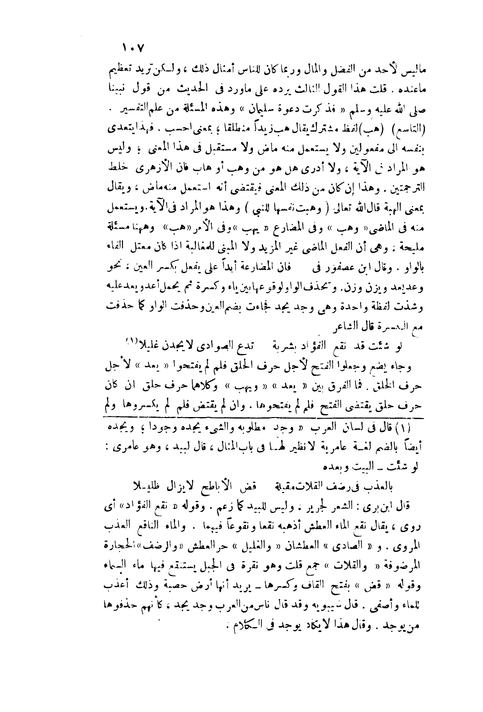 مَا لَيْسَ لِأَحَدٍ مِنْ الْفَضْلِ وَالْمَالِ وَرُبَّمَا كَانَ لِلنَّاسِ أَمْثَالُ ذَلِكَ، وَلَكِنْ تُرِيدُ تَعْظِيمَ مَا عِنْدَهُ. قُلْت هَذَا الْقَوْلُ الثَّالِثُ يَرُدُّهُ عَلَى مَا وَرَدَ فِي الْحَدِيثِ مِنْ قَوْلِ نَبِيِّنَا - صَلَّى اللَّهُ عَلَيْهِ وَسَلَّمَ - «فَذَكَرْت دَعْوَةَ سُلَيْمَانَ - عَلَيْهِ السَّلَامُ -» وَهَذِهِ الْمَسْأَلَةُ مِنْ عِلْمِ التَّفْسِيرِ.