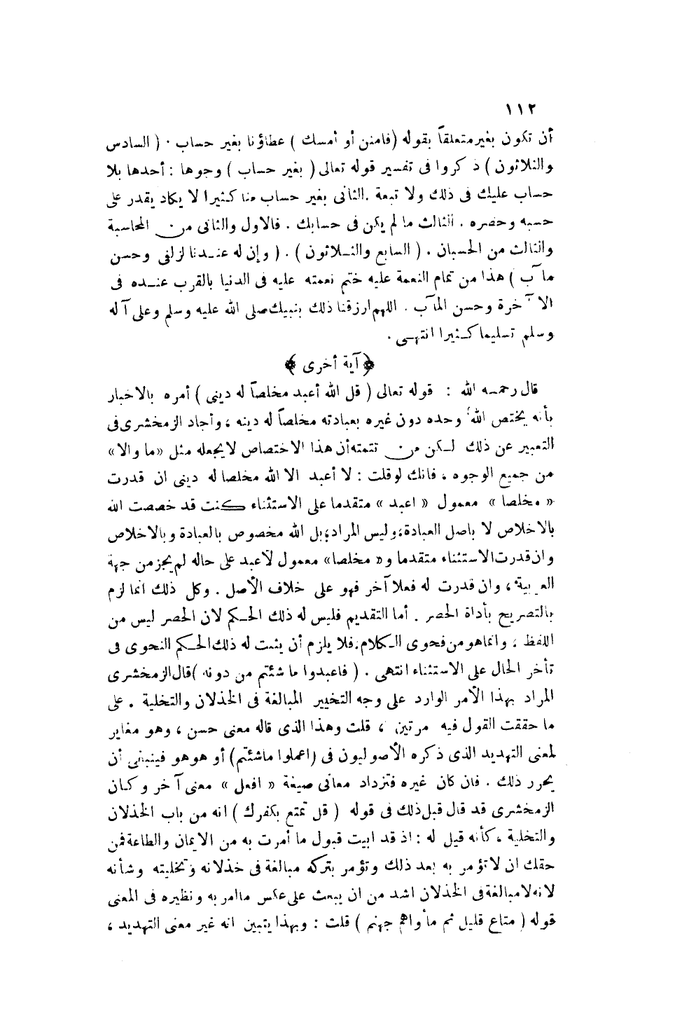 قَالَ - رَحِمَهُ اللَّهُ -: قَوْله تَعَالَى {قُلِ اللَّهَ أَعْبُدُ مُخْلِصًا لَهُ دِينِي} [الزمر: 14] أَمَرَهُ بِالْإِخْبَارِ بِأَنَّهُ يَخْتَصُّ اللَّهَ وَحْدَهُ دُونَ غَيْرِهِ بِعِبَادَتِهِ مُخْلِصًا لَهُ دِينَهُ، وَأَجَادَ الزَّمَخْشَرِيُّ فِي التَّعْبِيرِ عَنْ ذَلِكَ لَكِنْ مِنْ تَتِمَّتِهِ أَنَّ هَذَا الِاخْتِصَاصَ لَا يَجْعَلُهُ مِثْلَ " مَا وَإِلَّا " مِنْ جَمِيعِ الْوُجُوهِ، فَإِنَّك لَوْ قُلْت: لَا أَعْبُدُ إلَّا اللَّهَ مُخْلِصًا لَهُ دِينِي إنْ قَدَّرْت " مُخْلِصًا " مَعْمُولَ " أَعْبُدُ " مُتَقَدِّمًا عَلَى الِاسْتِثْنَاءِ كُنْت قَدْ خَصَصْت اللَّهَ بِالْإِخْلَاصِ لَا بِأَصْلِ الْعِبَادَةِ، وَلَيْسَ الْمُرَادُ؛ بَلْ اللَّهُ مَخْصُوصٌ بِالْعِبَادَةِ وَبِالْإِخْلَاصِ وَإِنْ قَدَّرْت الِاسْتِثْنَاءَ مُتَقَدِّمًا وَ " مُخْلِصًا " مَعْمُولٌ لِ أَعْبُدُ عَلَى حَالِهِ لَمْ يَجُزْ مِنْ جِهَةِ الْعَرَبِيَّةِ، وَإِنْ قَدَّرْت لَهُ فِعْلًا آخَرَ فَهُوَ عَلَى خِلَافِ الْأَصْلِ. وَكُلُّ ذَلِكَ إنَّمَا لَزِمَ بِالتَّصْرِيحِ بِأَدَاةِ الْحَصْرِ. أَمَّا التَّقْدِيمُ فَلَيْسَ لَهُ ذَلِكَ الْحُكْمُ لِأَنَّ الْحَصْرَ لَيْسَ مِنْ اللَّفْظِ، وَإِنَّمَا هُوَ مِنْ فَحَوَى الْكَلَامِ. فَلَا يَلْزَمُ أَنْ يَثْبُتَ لَهُ ذَلِكَ الْحُكْمُ النَّحْوِيُّ فِي تَأَخُّرِ الْحَالِ عَلَى الِاسْتِثْنَاءِ انْتَهَى. {فَاعْبُدُوا مَا شِئْتُمْ مِنْ دُونِهِ} [الزمر: 15] .