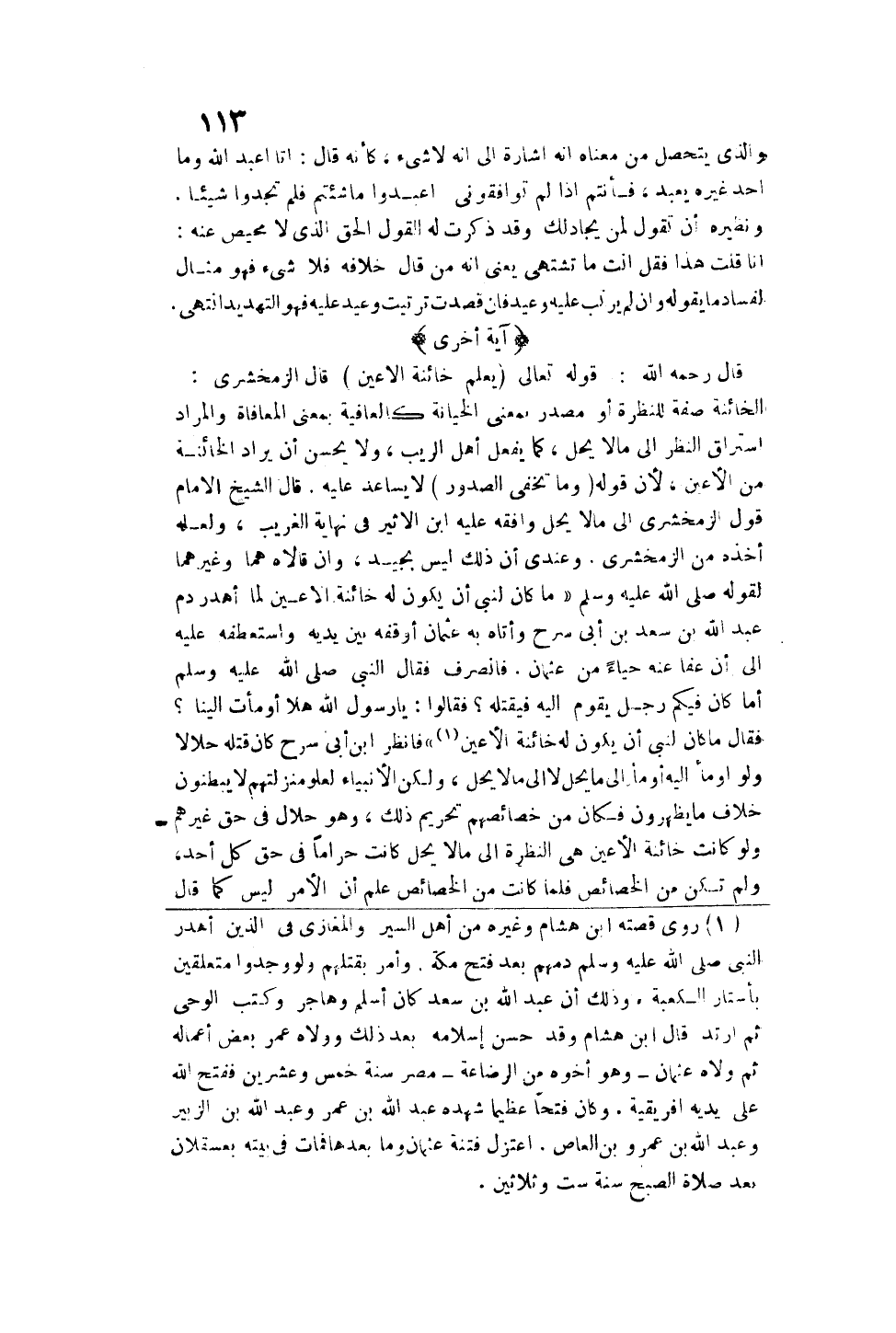 قَالَ الشَّيْخُ الْإِمَامُ قَوْلُ الزَّمَخْشَرِيِّ إلَى مَا لَا يَحِلُّ وَافَقَهُ عَلَيْهِ ابْنُ الْأَثِيرِ فِي نِهَايَةِ الْغَرِيبِ، وَلَعَلَّهُ أَخَذَهُ مِنْ الزَّمَخْشَرِيِّ. وَعِنْدِي أَنَّ ذَلِكَ لَيْسَ بِجَيِّدٍ، وَإِنْ قَالَاهُ هُمَا وَغَيْرُهُمَا لِقَوْلِهِ - صَلَّى اللَّهُ عَلَيْهِ وَسَلَّمَ - «مَا كَانَ لِنَبِيٍّ أَنْ يَكُونَ لَهُ خَائِنَةُ الْأَعْيُنِ لَمَّا أَهْدَرَ دَمَ عَبْدِ اللَّهِ بْنِ سَعْدِ بْنِ أَبِي سَرْحٍ وَأَتَاهُ بِهِ عُثْمَانُ أَوْقَفَهُ بَيْنَ يَدَيْهِ وَاسْتَعْطَفَهُ عَلَيْهِ إلَى أَنْ عَفَا عَنْهُ حَيَاءً مِنْ عُثْمَانَ. فَانْصَرَفَ فَقَالَ النَّبِيُّ - صَلَّى اللَّهُ عَلَيْهِ وَسَلَّمَ - أَمَا كَانَ فِيكُمْ رَجُلٌ يَقُومُ إلَيْهِ فَيَقْتُلُهُ؟ فَقَالُوا: يَا رَسُولَ اللَّهِ هَلَّا أَوْمَأْت إلَيْنَا؟ فَقَالَ مَا كَانَ لِنَبِيٍّ أَنْ يَكُونَ لَهُ خَائِنَةُ الْأَعْيُنِ» فَانْظُرْ ابْنُ أَبِي سَرْحٍ كَانَ قَتْلُهُ حَلَالًا وَلَوْ أَوْمَأَ إلَيْهِ أَوْمَأَ إلَى مَا يَحِلُّ لَا إلَى مَا لَا يَحِلُّ، وَلَكِنَّ الْأَنْبِيَاءَ لِعُلُوِّ مَنْزِلَتِهِمْ لَا يُبْطِنُونَ خِلَافَ مَا يُظْهِرُونَ فَكَانَ مِنْ خَصَائِصِهِمْ تَحْرِيمُ ذَلِكَ، وَهُوَ حَلَالٌ فِي حَقِّ غَيْرِهِمْ وَلَوْ كَانَتْ خَائِنَةُ الْأَعْيُنِ هِيَ النَّظْرَةُ إلَى مَا لَا يَحِلُّ كَانَتْ حَرَامًا فِي حَقِّ كُلِّ أَحَدٍ، وَلَمْ تَكُنْ مِنْ الْخَصَائِصِ فَلَمَّا كَانَتْ مِنْ الْخَصَائِصِ عُلِمَ أَنَّ الْأَمْرَ لَيْسَ كَمَا قَالَ