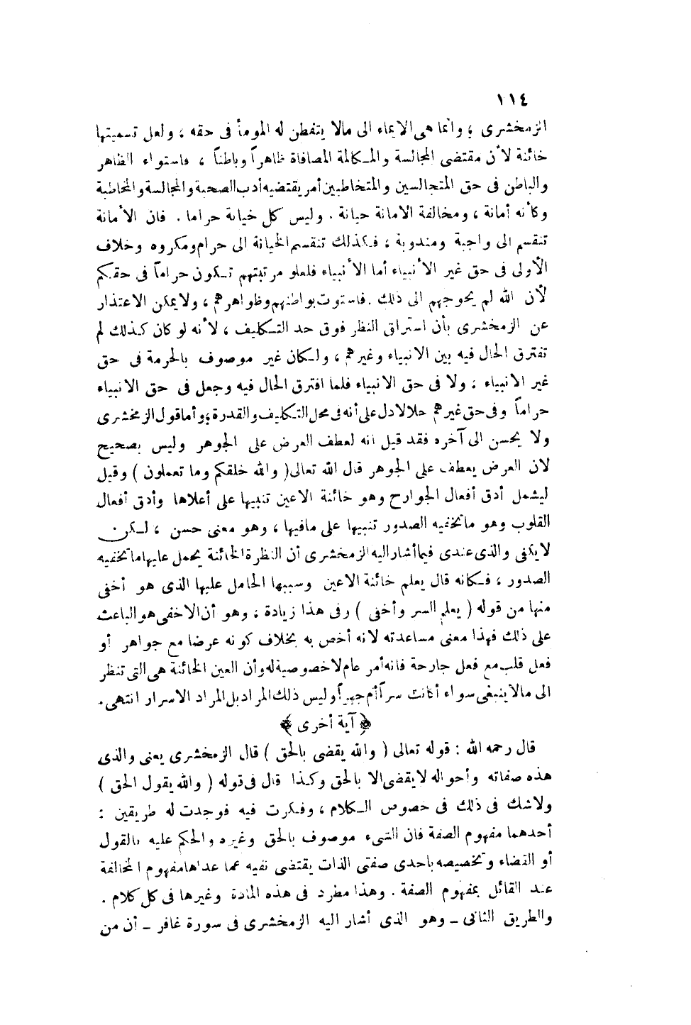 الزَّمَخْشَرِيُّ؛ وَإِنَّمَا هِيَ الْإِيمَاءُ إلَى مَا لَا يَتَفَطَّنُ لَهُ الْمُومَأُ فِي حَقِّهِ، وَلَعَلَّ تَسْمِيَتَهَا خَائِنَةً لِأَنَّ مُقْتَضَى الْمُجَالَسَةِ وَالْمُكَالَمَةِ الْمُصَافَاةُ ظَاهِرًا وَبَاطِنًا، فَاسْتِوَاءُ الظَّاهِرِ وَالْبَاطِنِ فِي حَقِّ الْمُتَجَالِسِينَ وَالْمُتَخَاطَبِينَ أَمْرٌ يَقْتَضِيهِ أَدَبُ الصُّحْبَةِ وَالْمُجَالَسَةِ وَالْمُخَاطَبَةِ وَكَأَنَّهُ أَمَانَةٌ، وَمُخَالَفَةٌ الْأَمَانَةِ خِيَانَةٌ. وَلَيْسَ كُلُّ خِيَانَةٍ حَرَامًا. فَإِنَّ الْأَمَانَةَ تَنْقَسِمُ إلَى وَاجِبَةٍ وَمَنْدُوبَةٍ، فَكَذَلِكَ تَنْقَسِمُ الْخِيَانَةُ إلَى حَرَامٍ وَمَكْرُوهٍ وَخِلَافُ الْأَوَّلِ فِي حَقِّ غَيْرِ الْأَنْبِيَاءِ أَمَّا الْأَنْبِيَاءُ فَلِعُلُوِّ مَرْتَبَتِهِمْ تَكُونُ حَرَامًا فِي حَقِّكُمْ لِأَنَّ اللَّهَ لَمْ يَحُجَّهُمْ إلَى ذَلِكَ. فَاسْتَوَتْ بَوَاطِنُهُمْ وَظَوَاهِرُهُمْ، وَلَا يُمْكِنُ الِاعْتِذَارُ عَنْ الزَّمَخْشَرِيِّ بِأَنَّ اسْتِرَاقَ النَّظَرِ فَوْقَ حَدِّ التَّكْلِيفِ، لِأَنَّهُ لَوْ كَانَ كَذَلِكَ لَمْ تَفْتَرِقْ الْحَالُ فِيهِ بَيْنَ الْأَنْبِيَاءِ وَغَيْرِهِمْ، وَلَكَانَ غَيْرَ مَوْصُوفٍ بِالْحُرْمَةِ فِي حَقِّ غَيْرِ الْأَنْبِيَاءِ، وَلَا فِي حَقِّ الْأَنْبِيَاءِ فَلَمَّا افْتَرَقَ الْحَالُ فِيهِ وَجُعِلَ فِي حَقِّ الْأَنْبِيَاءِ حَرَامًا وَفِي حَقِّ غَيْرِهِمْ حَلَالًا دَلَّ عَلَى أَنَّهُ فِي مَحَلِّ التَّكْلِيفِ وَالْقُدْرَةِ.