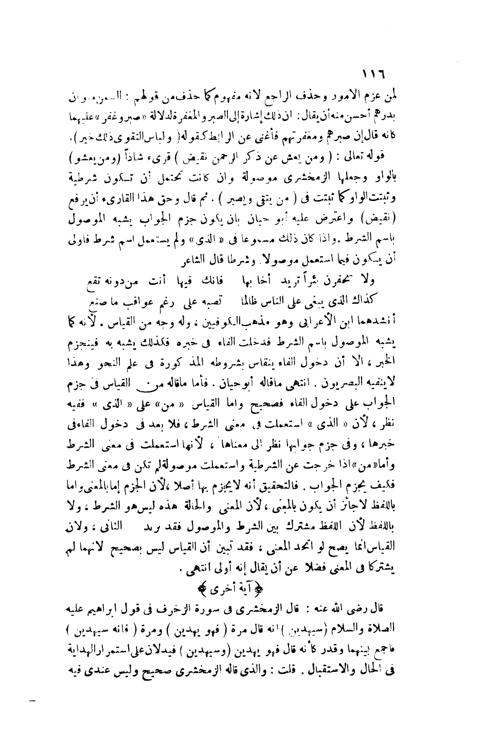 قَوْله تَعَالَى: {وَمَنْ يَعْشُ عَنْ ذِكْرِ الرَّحْمَنِ نُقَيِّضْ} [الزخرف: 36] قُرِئَ شَاذًّا (وَمَنْ يَعْشُو) بِالْوَاوِ وَجَعَلَهَا الزَّمَخْشَرِيُّ مَوْصُولَةً وَإِنْ كَانَتْ تُحْتَمَلُ أَنْ تَكُونَ شَرْطِيَّةً وَثَبَتَتْ الْوَاوُ كَمَا ثَبَتَتْ فِي (مَنْ يَتَّقِي وَيَصْبِرُ) . ثُمَّ قَالَ وَحَقُّ هَذَا الْقَارِئِ أَنْ يَرْفَعَ (نُقَيِّضْ) وَاعْتَرَضَ عَلَيْهِ أَبُو حَيَّانَ بِأَنْ يَكُونَ جَزْمُ الْجَوَابِ يُشَبِّهُ الْمَوْصُولَ بِاسْمِ الشَّرْطِ. وَإِذَا كَانَ ذَلِكَ مَسْمُوعًا فِي " الَّذِي " وَلَمْ يُسْتَعْمَلْ اسْمُ شَرْطٍ فَأَوْلَى أَنْ يَكُونَ فِيمَا اُسْتُعْمِلَ مَوْصُولًا. وَشَرْطًا قَالَ الشَّاعِرُ