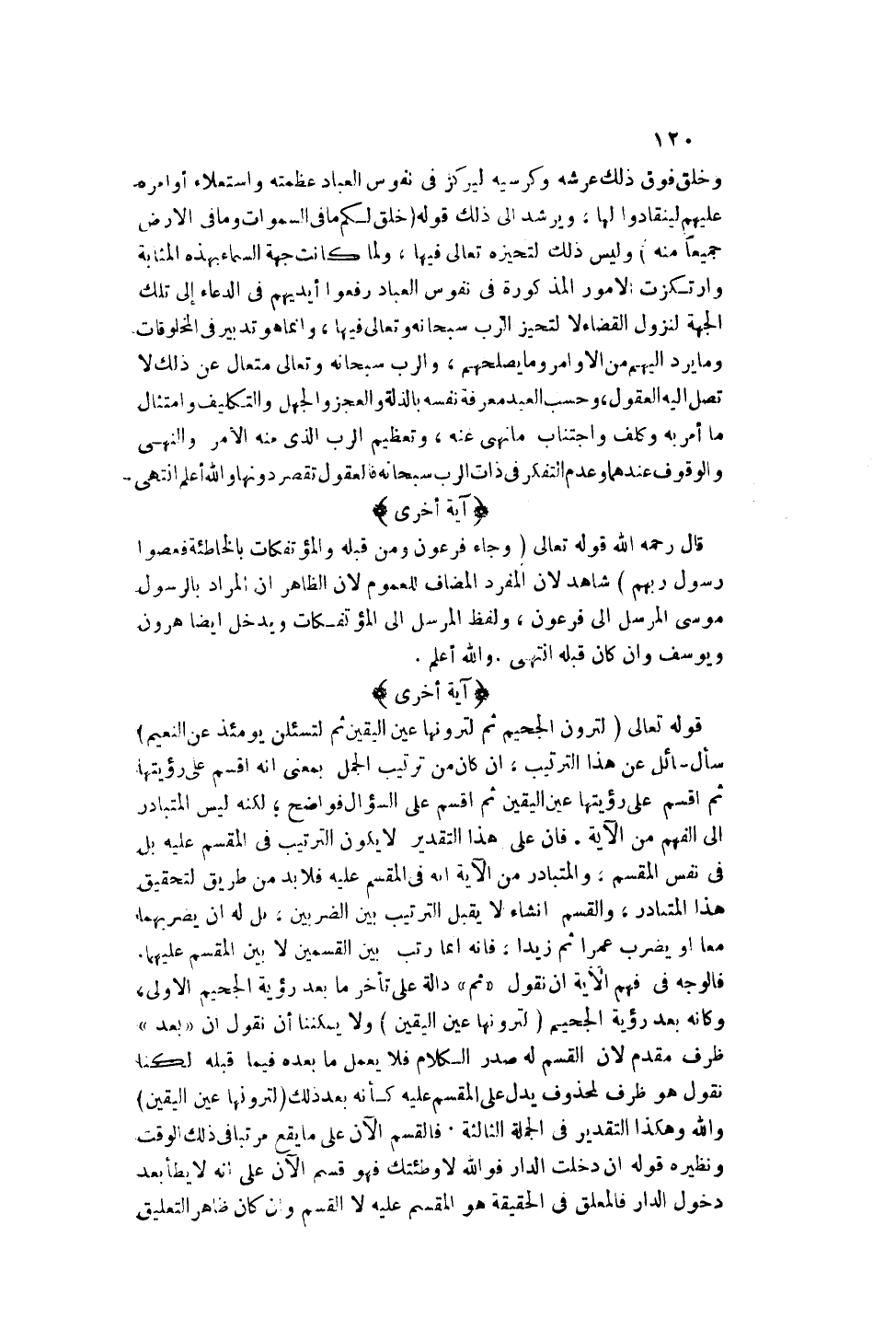 فَالْوَجْهُ فِي فَهْمِ الْآيَةِ أَنْ نَقُولَ " ثُمَّ " دَالَّةٌ عَلَى تَأَخُّرِ مَا بَعْدَ رُؤْيَةِ الْجَحِيمِ الْأُولَى، وَكَأَنَّهُ بَعْدَ رُؤْيَةِ الْجَحِيمِ {لَتَرَوُنَّهَا عَيْنَ الْيَقِينِ} [التكاثر: 7] وَلَا يُمْكِنُنَا أَنْ نَقُولَ إنَّ " بَعْدَ " ظَرْفٌ مُقَدَّمٌ لِأَنَّ الْقَسَمَ لَهُ صَدْرُ الْكَلَامِ فَلَا يَعْمَلُ مَا بَعْدَهُ فِيمَا قَبْلَهُ لَكِنَّا نَقُولُ هُوَ ظَرْفٌ لِمَحْذُوفٍ يَدُلُّ عَلَى الْمُقْسَمِ عَلَيْهِ كَأَنَّهُ بَعْدَ ذَلِكَ {لَتَرَوُنَّهَا عَيْنَ الْيَقِينِ} [التكاثر: 7] وَاَللَّهِ وَهَكَذَا التَّقْدِيرُ فِي الْجُمْلَةِ الثَّالِثَةِ. فَالْقَسَمُ الْآنَ عَلَى مَا يَقَعُ مُرَتَّبًا فِي ذَلِكَ الْوَقْتِ وَنَظِيرُهُ قَوْلُهُ إنْ دَخَلْتِ الدَّارَ فَوَاَللَّهِ لَا وَطَئْتُكِ فَهُوَ قَسَمٌ الْآنَ عَلَى أَنَّهُ لَا يَطَأُ بَعْدَ دُخُولِ الدَّارِ فَالْمُعَلَّقُ فِي الْحَقِيقَةِ هُوَ الْمُقْسَمُ عَلَيْهِ لَا الْقَسَمُ وَإِنْ كَانَ ظَاهِرُ التَّعْلِيقِ