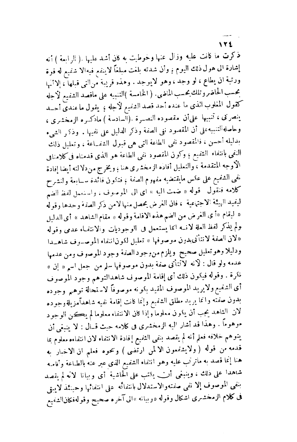 وَهَذَا قَدْ أَشَارَ إلَيْهِ الزَّمَخْشَرِيُّ فِي كَلَامِهِ حَيْثُ قَالَ: لَا يَنْبَغِي أَنْ يُتَوَهَّمَ خِلَافُهُ فَعُلِمَ أَنَّهُ لَمْ يَقْصِدْ بِنَفْيِ الشَّفِيعِ إفَادَةَ الِانْتِفَاءِ لِأَنَّ انْتِفَاءَهُ مَعْلُومٌ بِمَا قَدَّمَهُ مِنْ قَوْلِهِ {وَلا يَشْفَعُونَ إِلا لِمَنِ ارْتَضَى} [الأنبياء: 28] وَنَحْوِهِ فَعُلِمَ أَنَّ الْإِخْبَارَ بِهِ هُنَا إنَّمَا قُصِدَ بِهِ مَا تَرَتَّبَ عَلَيْهِ وَهُوَ انْتِفَاءُ الشَّفِيعِ الَّذِي عَبَّرَ عَنْهُ بِالطَّاعَةِ وَأَقَامَهُ شَاهِدًا عَلَى ذَلِكَ، وَيَنْبَغِي أَنْ يَكْتُبَ عَلَى الْحَاشِيَةِ أَيْ وَبَيَانًا لِأَنَّهُ لَمْ يَقْصِدْ بِنَفْيِ الْمَوْصُوفِ إلَّا نَفْيَ صِفَتِهِ وَالِاسْتِدْلَالَ بِانْتِفَائِهِ عَلَى انْتِفَائِهَا وَحِينَئِذٍ لَا يَبْقَى فِي كَلَامِ الزَّمَخْشَرِيِّ إشْكَالٌ وَقَوْلُهُ " وَبَيَانُهُ " إلَى آخِرِهِ صَحِيحٌ وَقَوْلُهُ فَكَانَ الشَّفِيعُ